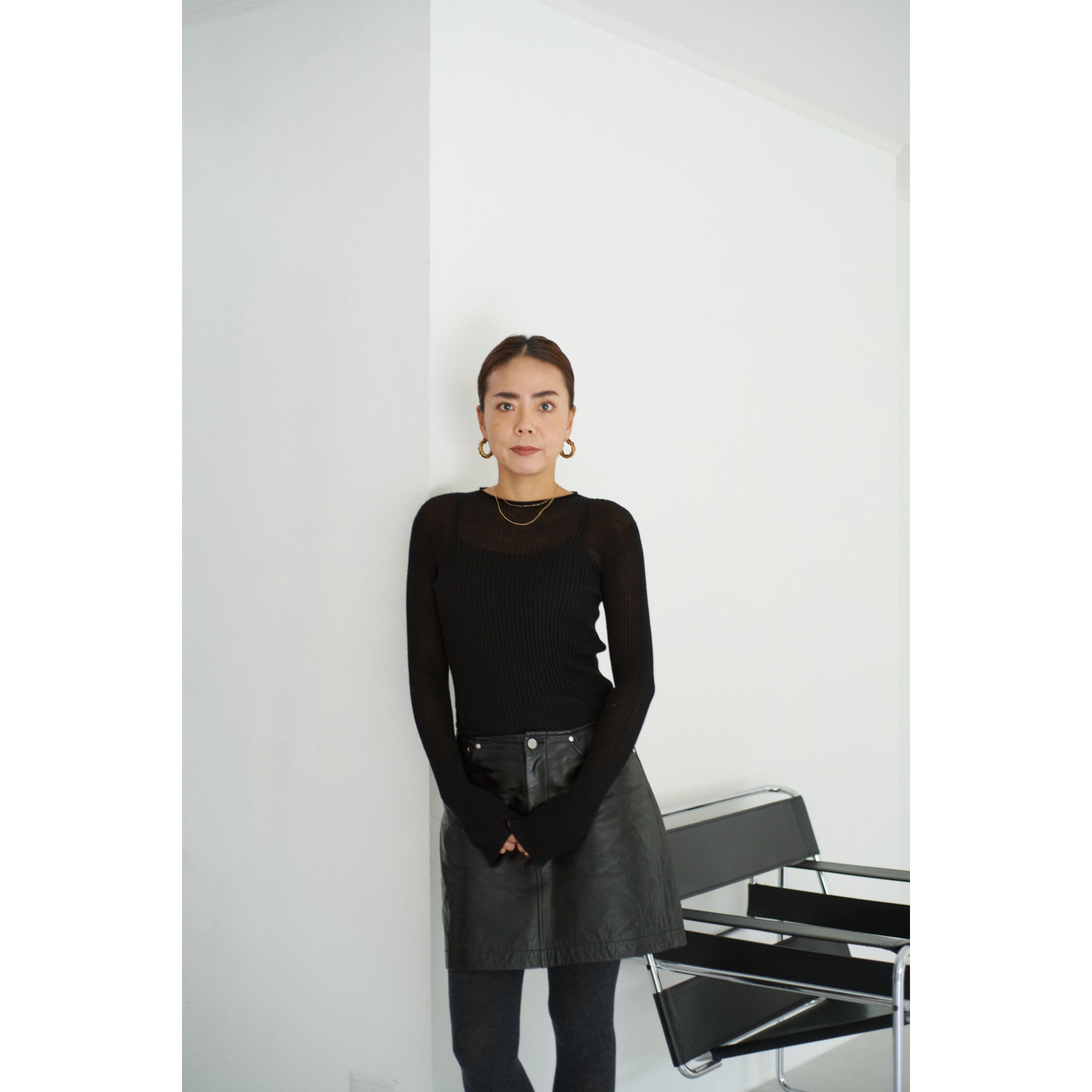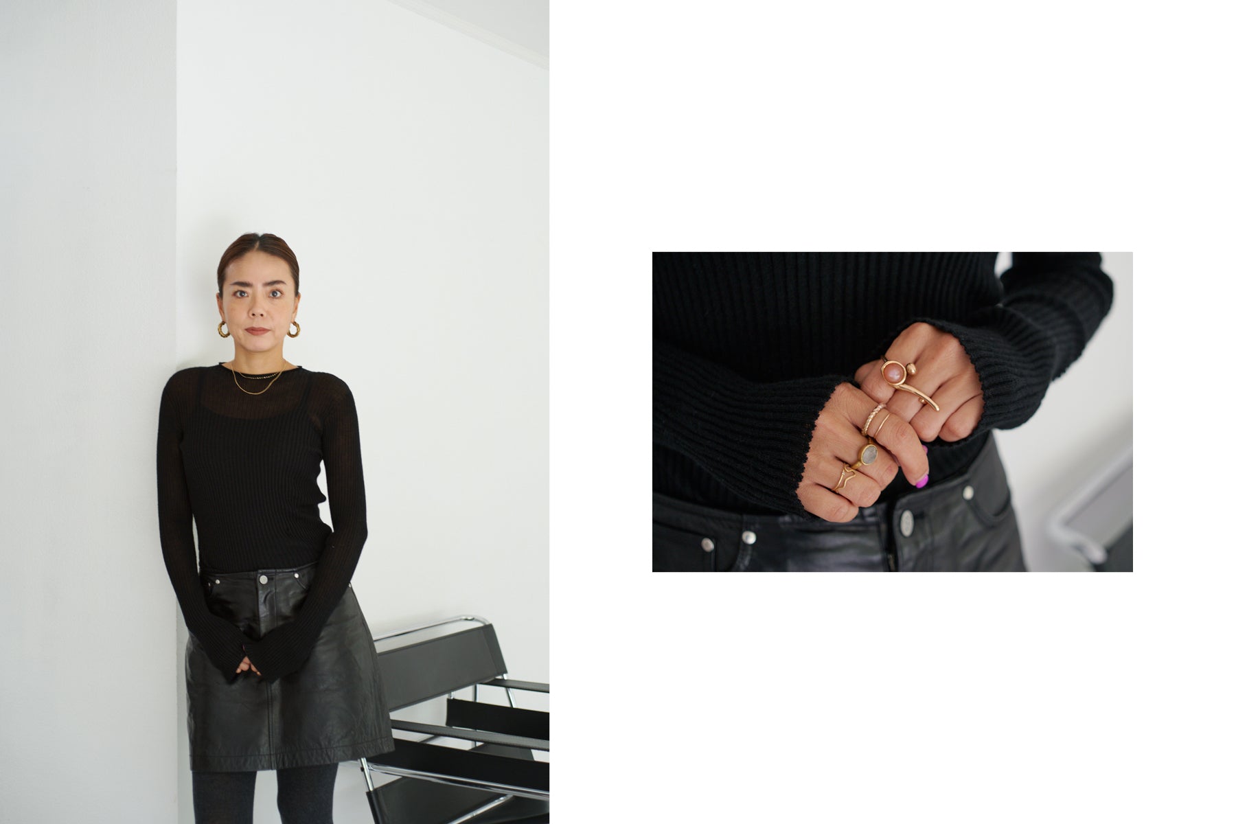 ワントーンで楽しむTHE SHINZONEのニットとレザースカート。凝ったデザインやレイヤードを駆使するより、シンプルなアイテムをシンプルに着こなすのがモットー。代わりにジュエリーとネイルをアクセントにしている。「ピアスは必ず。指輪、ブレスレットはセットで。洋服に合わせてゴールドとシルバーとトーンを変えています。指輪に関しては、ガツっとインパクトのあるものが好みで、基本全部の指につける派です」。また年齢を重ねて、大切にするようになったのは着心地。「かつてのようにチクチクするけれど可愛いから……と選ぶことが無くなりました。上質で肌触りのいいニットはつい、手が伸びますね」