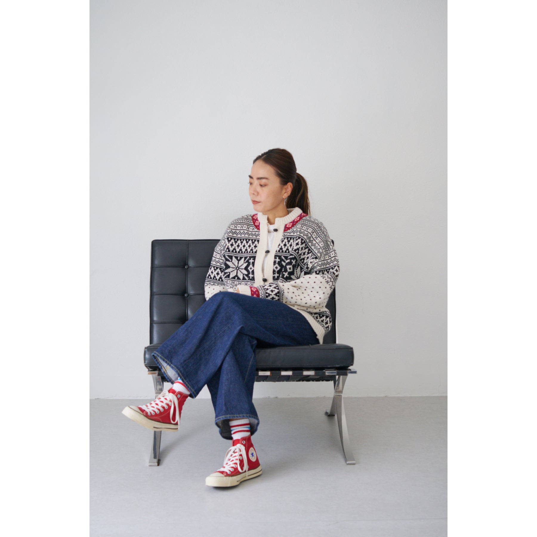 ニットに合わせたのは、フレアシルエットが特徴の22AWのTHE SHINZONEのANNIE JEANS。デニムパンツの似合うヘルシーな体型は社内でも定評が。「運動は欠かさず、15年ほど地元湘南の海沿いを5キロ40分で週3位走り続けています。筋トレはたまに。夏はジョギングの後に海でのんびりするのが日課です」