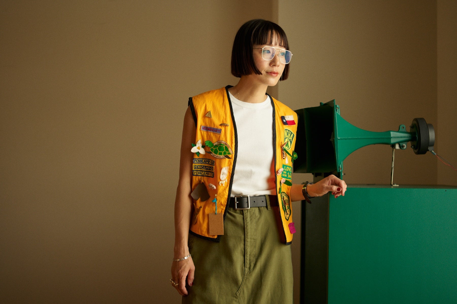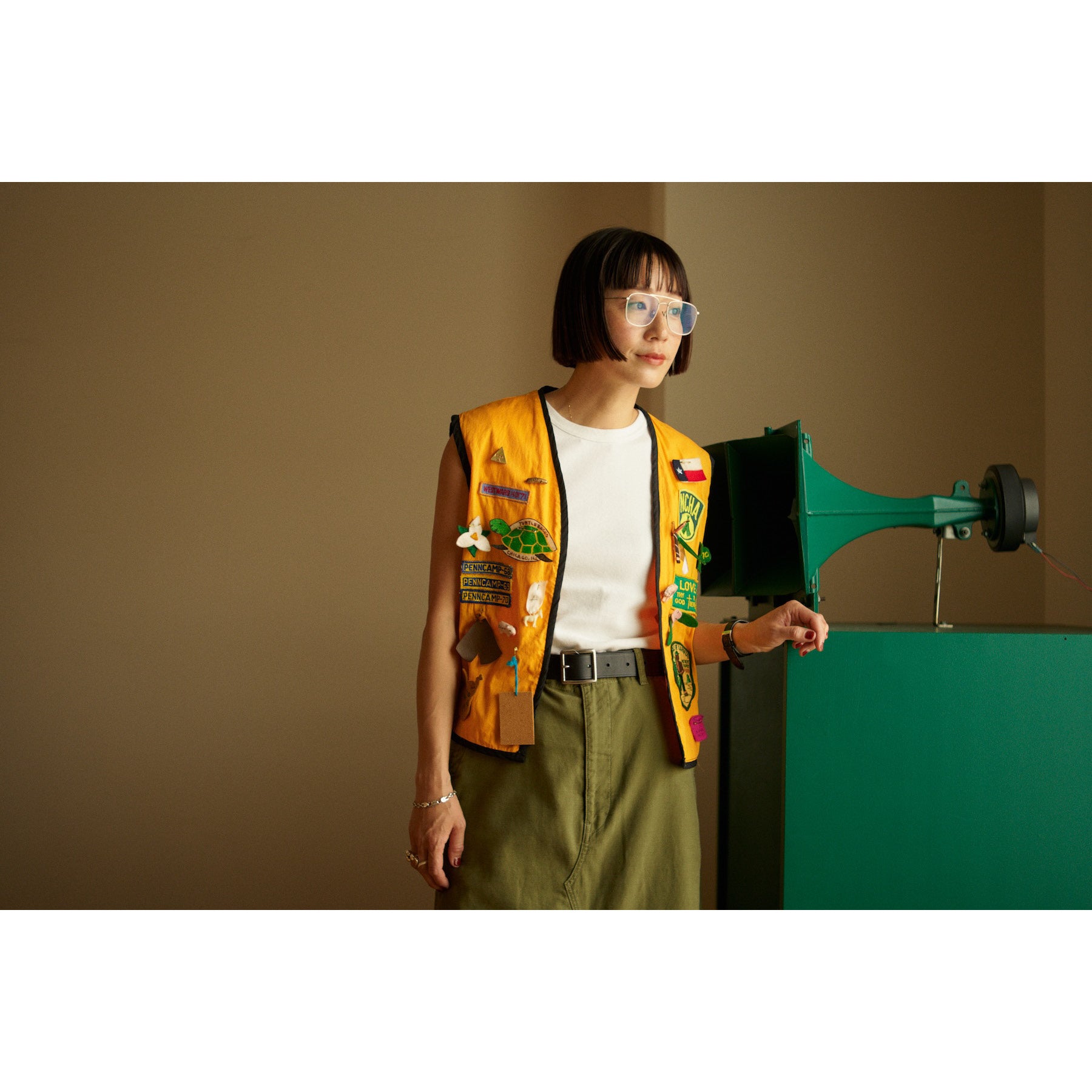 THE SHINZONEの「CIRCULAR RIB SLEEVELESS」と「WASHED BAKER SKIRT」に、ヴィヴィッドなヴィンテージのベストをプラスして、アクセントに。ボーイスカウトで使われていたベストらしく、あちこちにユニークなワッペンやネームタグが。