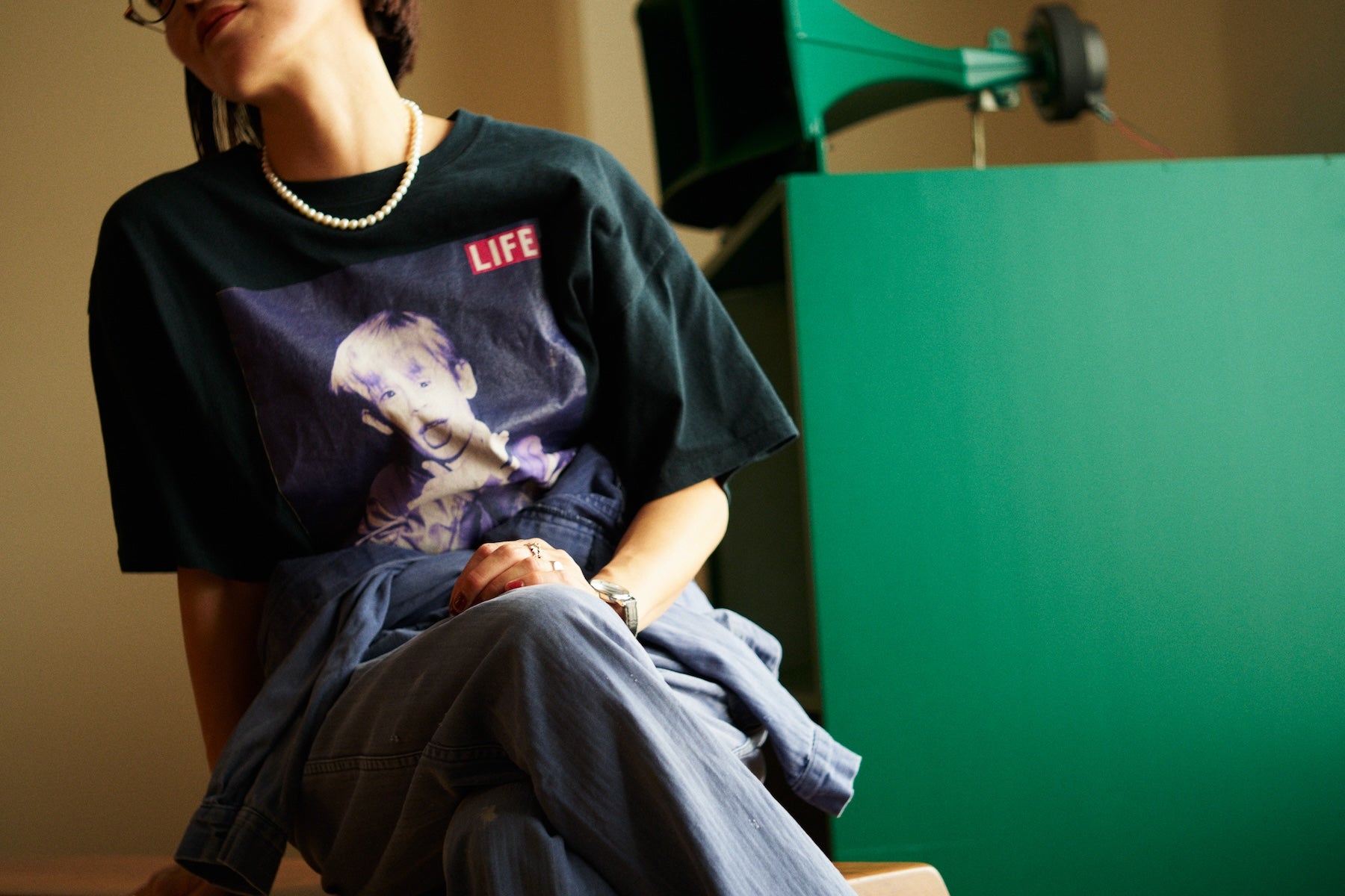 ヴィンテージのオールインワンに合わせたのは、マコーレー・カルキンが主張する同じくヴィンテージのTシャツ。数年前に展開していたShinzoneオリジナルのパンプスと「CADEAUX」のパールネックレスほか、アクセサリーでセンシュアルなタッチをプラス。
