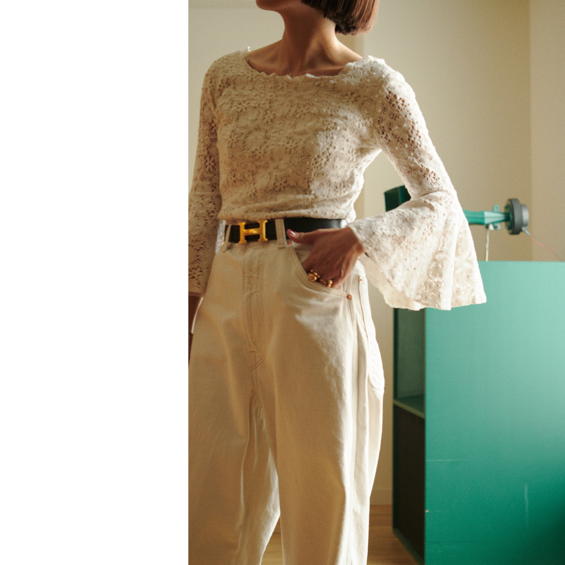 トップスは「SEA NEWYORK」。ヴィンテージのパッチワークデニムを合わせ、シンプルながらもフォーキーなムードが漂うスタイリング。シューズは「Maison Margiela」。