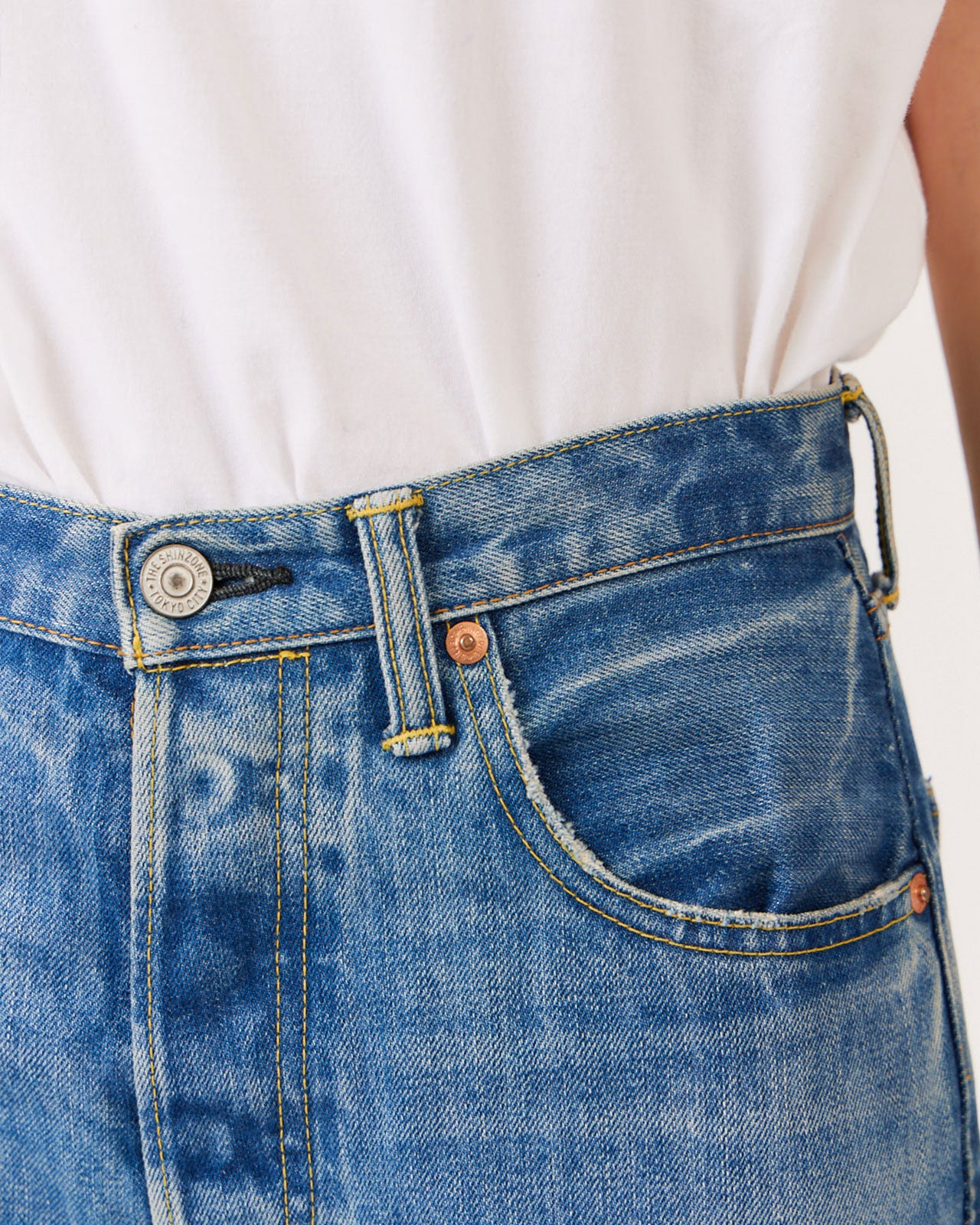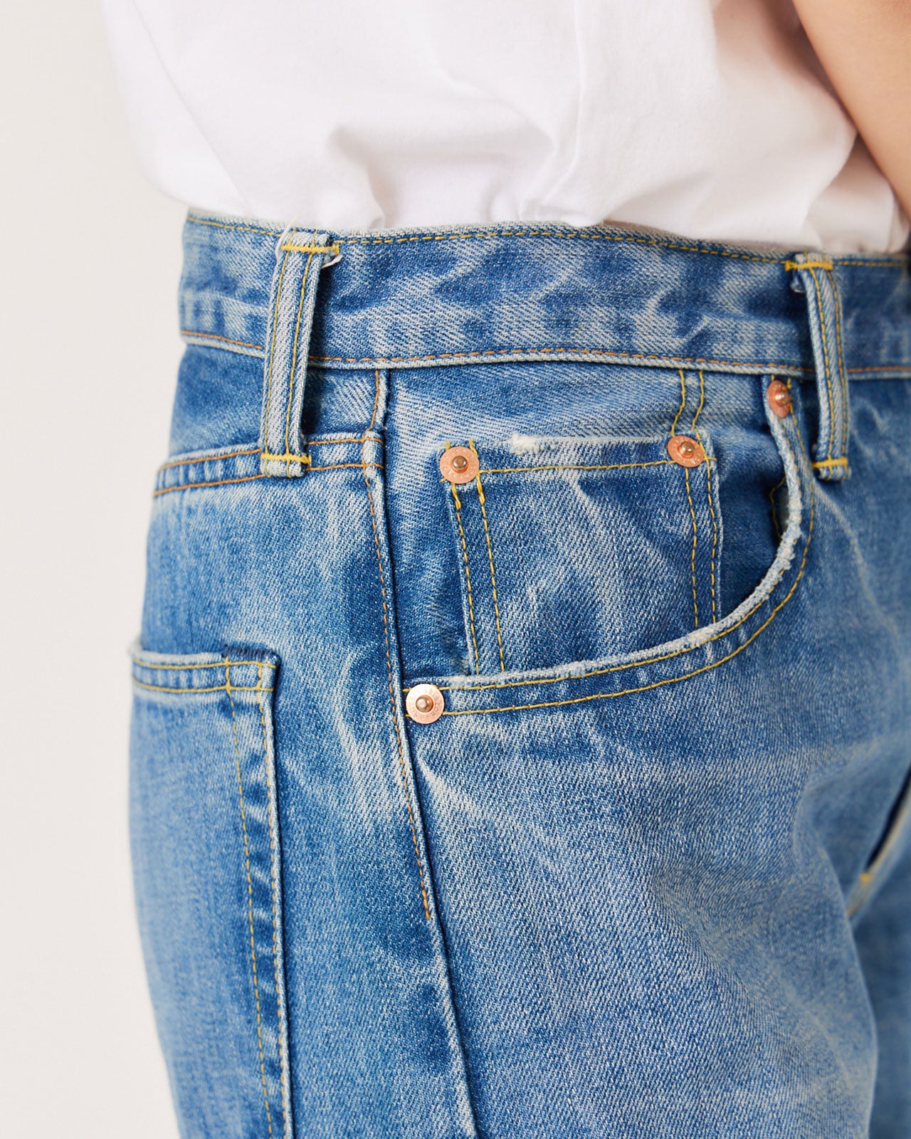 ヴィンテージデニムで一番美しい色とでも言うべき、ここから穿き込んで楽しめる濃いめのカラー。古着で気になる股上のもたつきを綺麗にパターンで修正しています。これによってスッキリとした印象でスタイル良く穿いていただくことができます。