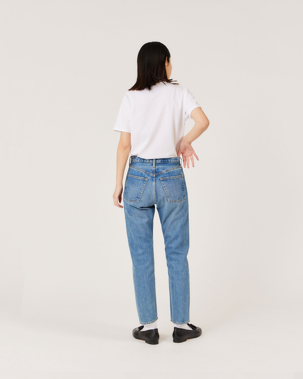 ウエスト位置をジャストで履けるシルエットに。ハイでもロウでもない、履きやすいバランスのデニムに仕上げました。