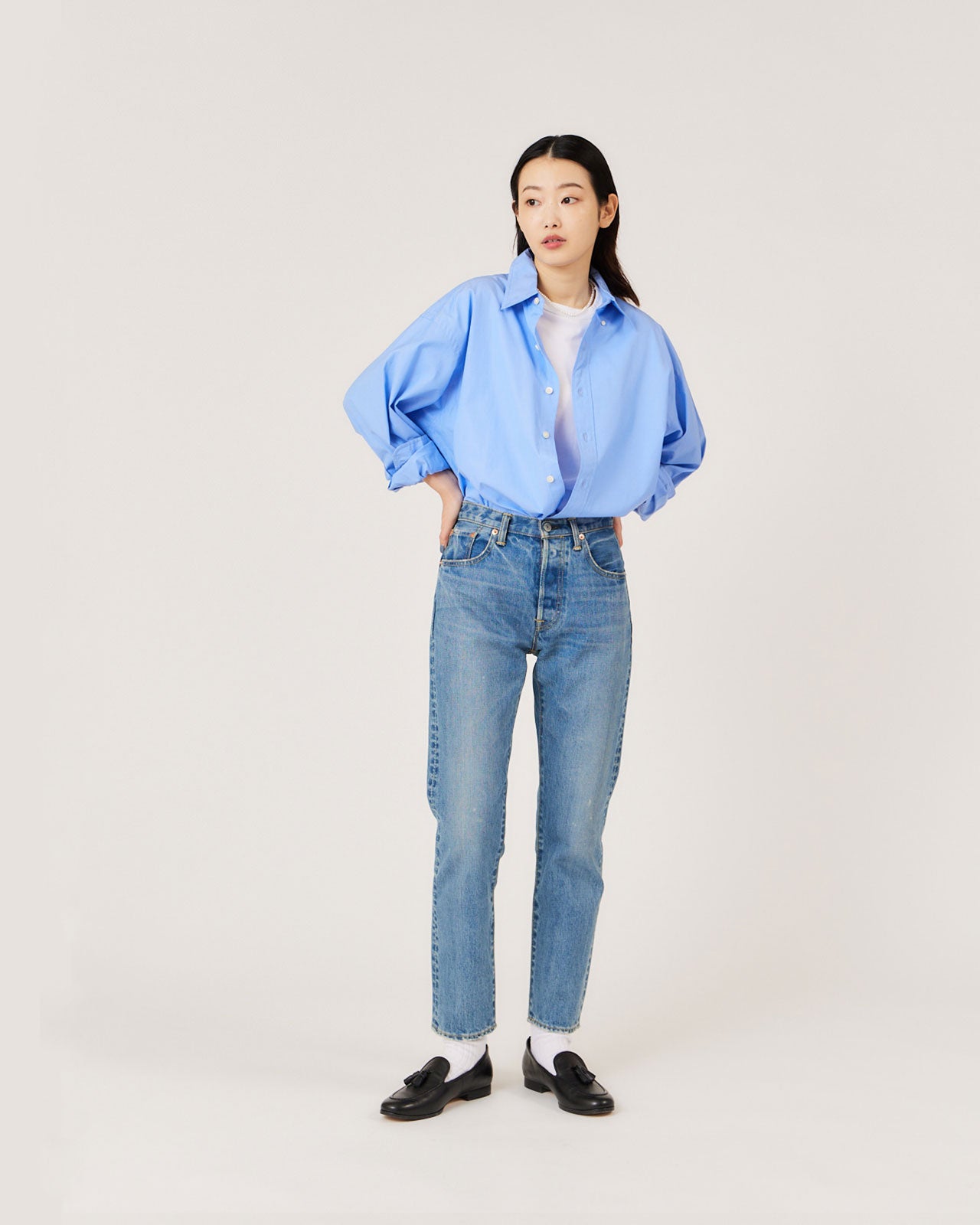体にしっかりフィットしつつタイト過ぎないシルエットで、スタイルをよく見せてくれます。色落ちが綺麗なブルーは、女性らしいブラウスやメンズライクな古着など幅広いお洋服と相性抜群なので愛用しています。