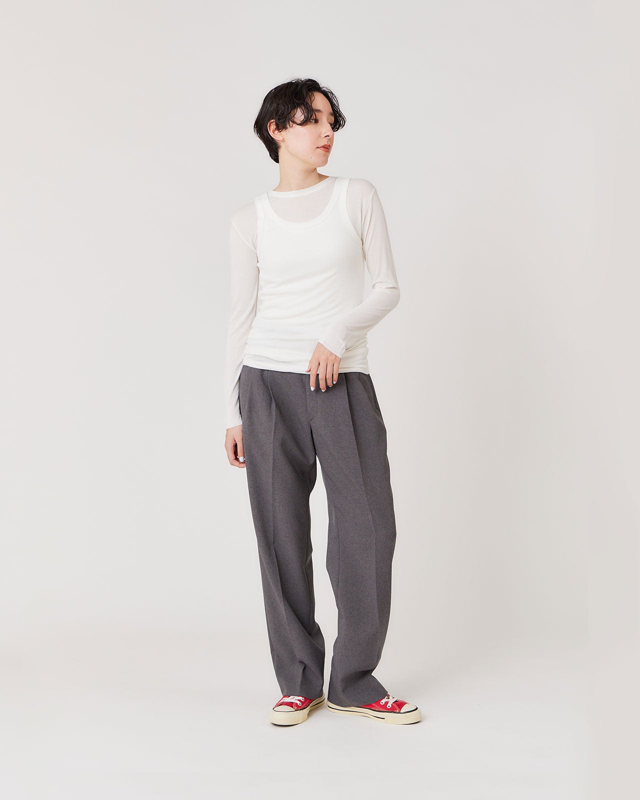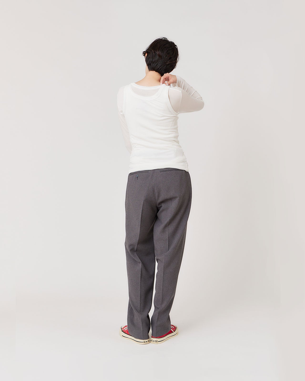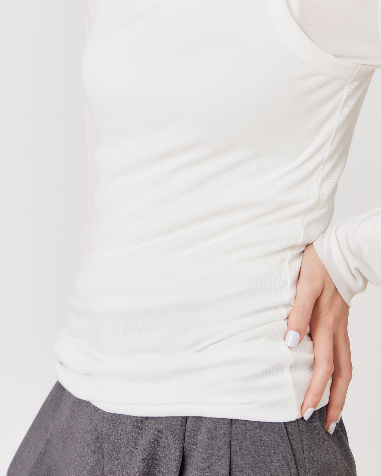 とても伸縮性のあるリブのタンクトップ。ネックとアームの開きにこだわり、背中が開いたトップスの中に着た際に見えないように、背中の空きを広くしています。