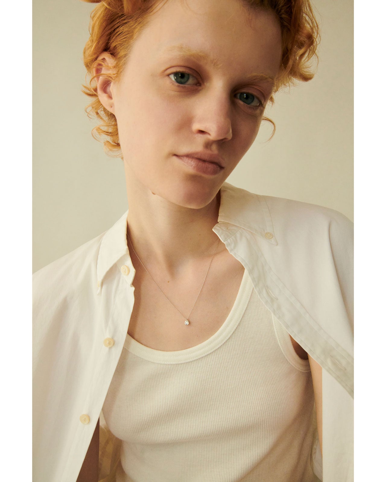 7色の虹色のような眩い輝きが最大限に拡散されるよう、オリジナルの型を制作し、独自性のある軽やかでミニマムな立て爪を実現しました。熟練の職人の手技により、ダイヤモンドをひとつひとつ石留し、安定感と繊細さを併せ持つ1粒ネックレスとピアスに仕立てています。