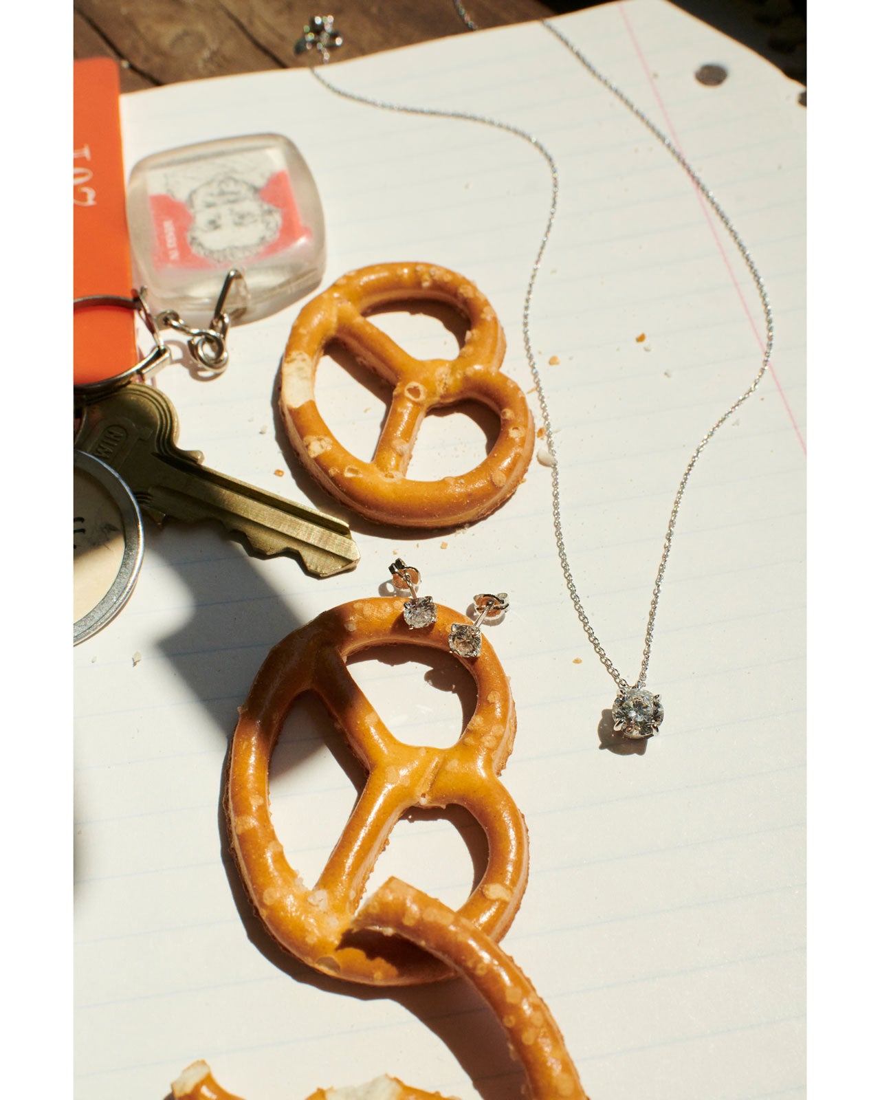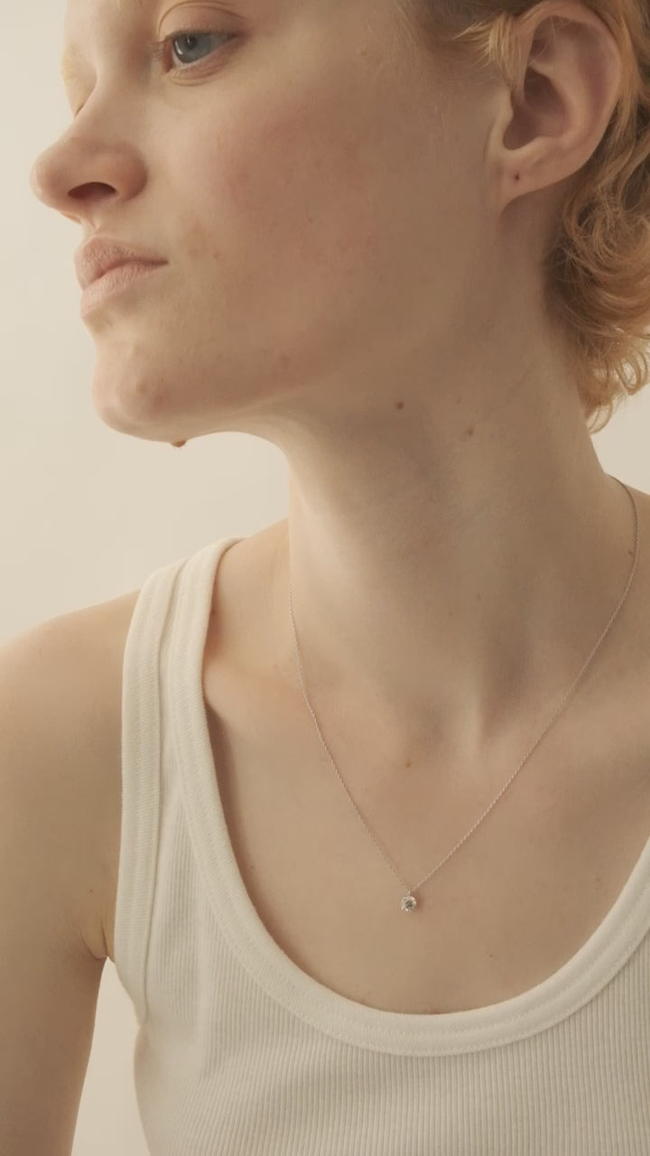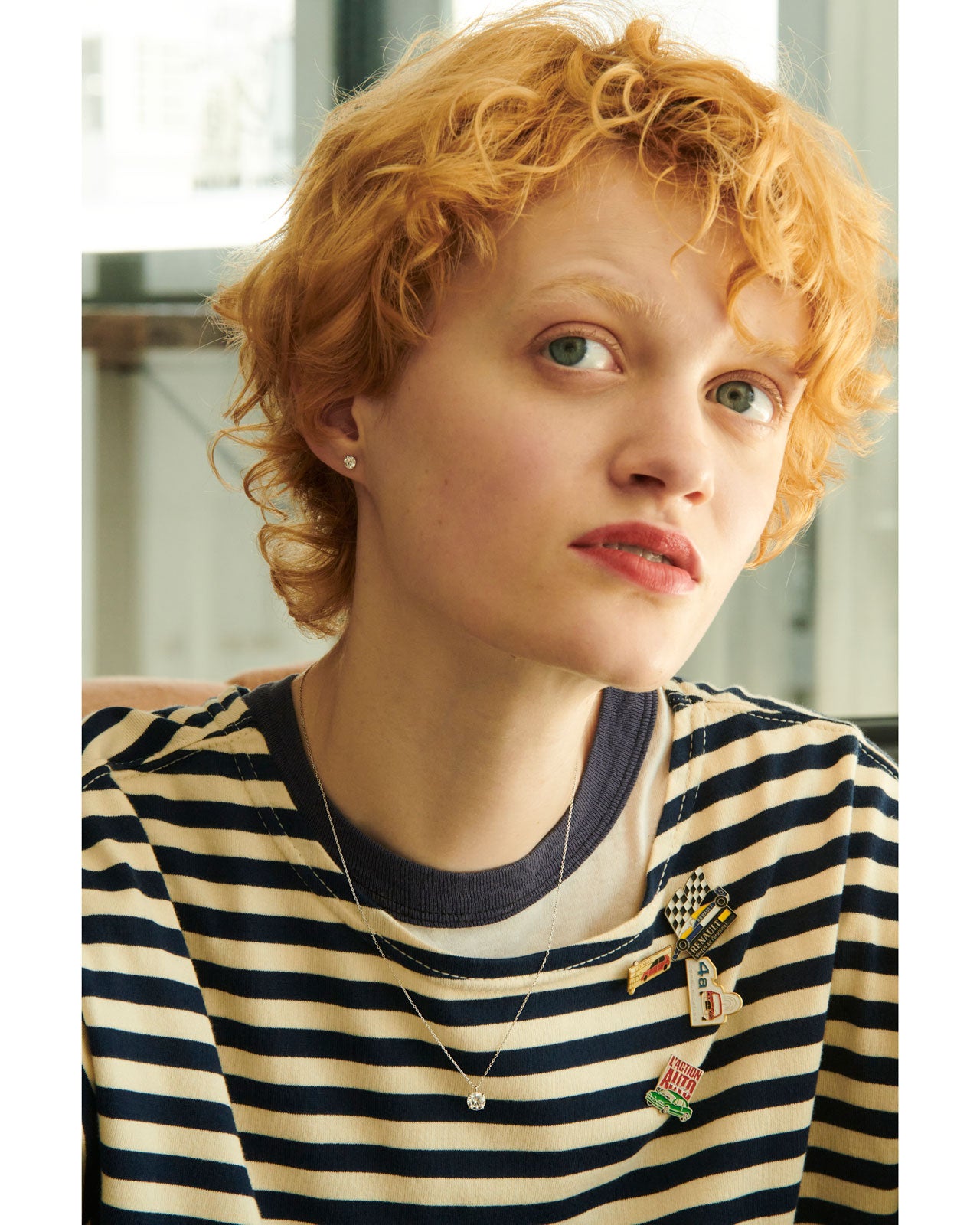 7色の虹色のような眩い輝きが最大限に拡散されるよう、オリジナルの型を制作し、独自性のある軽やかでミニマムな立て爪を実現しました。熟練の職人の手技により、ダイヤモンドをひとつひとつ石留し、安定感と繊細さを併せ持つ1粒ネックレスとピアスに仕立てています。