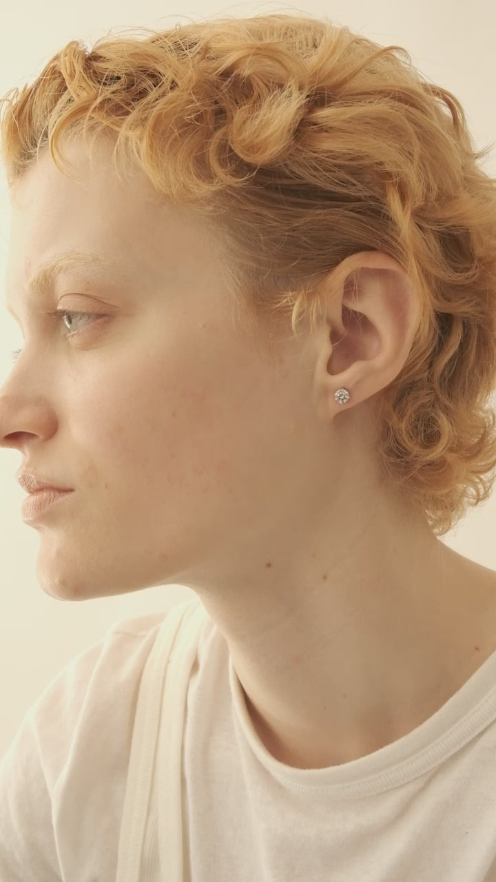 7色の虹色のような眩い輝きが最大限に拡散されるよう、オリジナルの型を制作し、独自性のある軽やかでミニマムな立て爪を実現しました。熟練の職人の手技により、ダイヤモンドをひとつひとつ石留し、安定感と繊細さを併せ持つ1粒ネックレスとピアスに仕立てています。