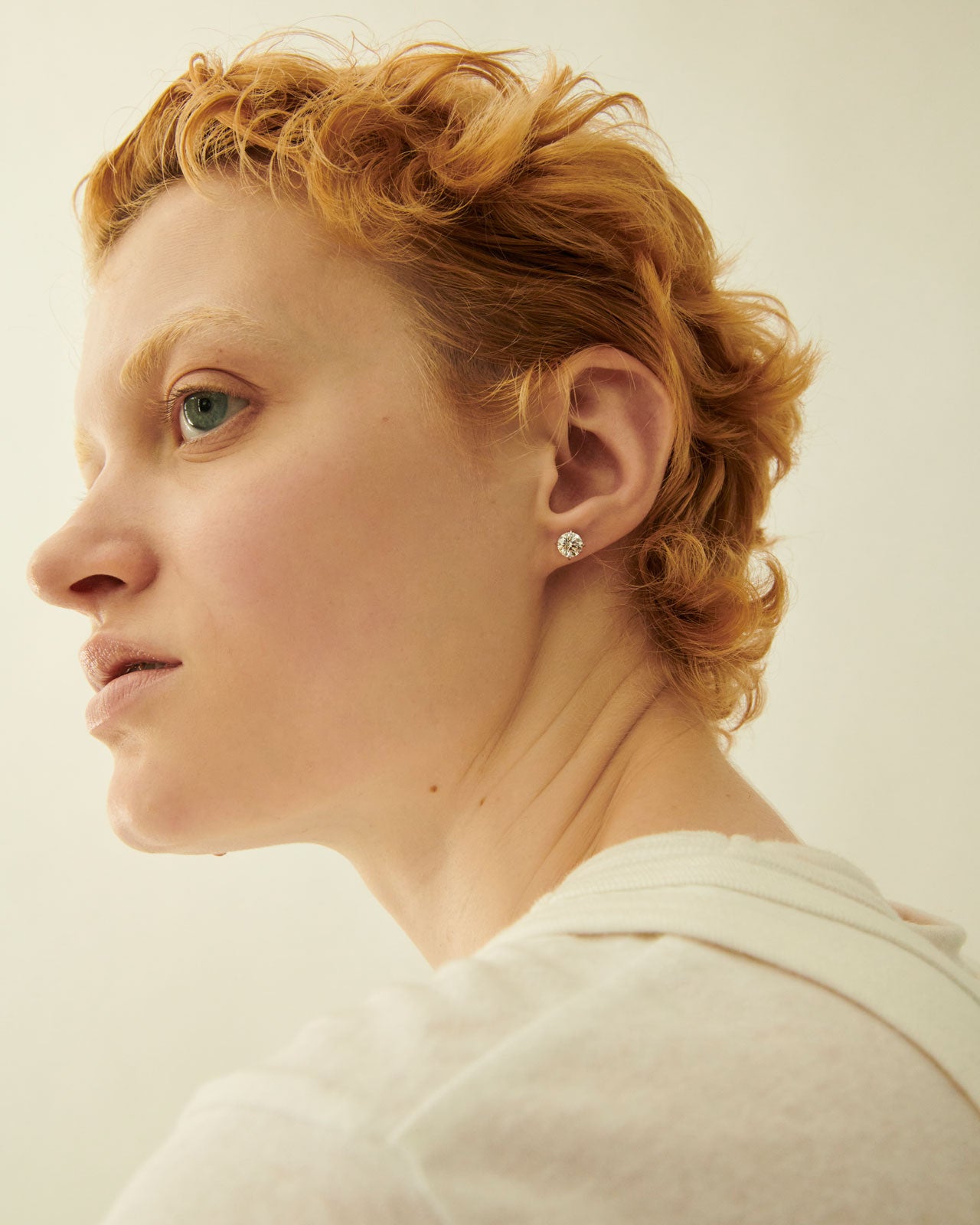 7色の虹色のような眩い輝きが最大限に拡散されるよう、オリジナルの型を制作し、独自性のある軽やかでミニマムな立て爪を実現しました。熟練の職人の手技により、ダイヤモンドをひとつひとつ石留し、安定感と繊細さを併せ持つ1粒ネックレスとピアスに仕立てています。