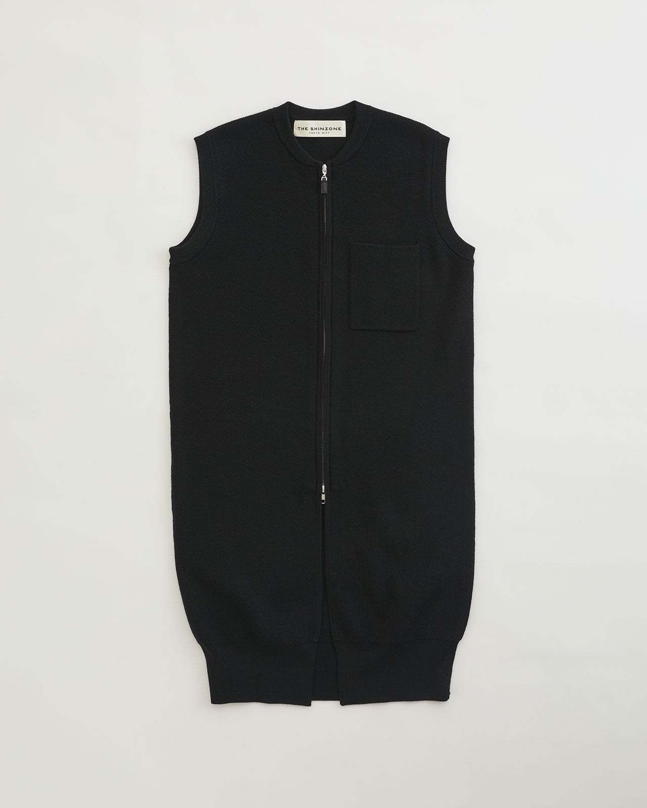 梳毛ウールを使用したニットジレです。しっかりした素材感を感じさせながらも軽さが魅力の片畔編みで仕上げました。襟のリブを細めにし、繊細なニュアンスをプラス。さらにアームホールを太めにし、脇をアウトリンキング仕様にしています。ジップが上下で開け閉めできるため、裾からスカートやドレスをのぞかせたり、ジップを閉めてベルトでウエストマークするなど、様々な着こなしがお楽しみいただけます。