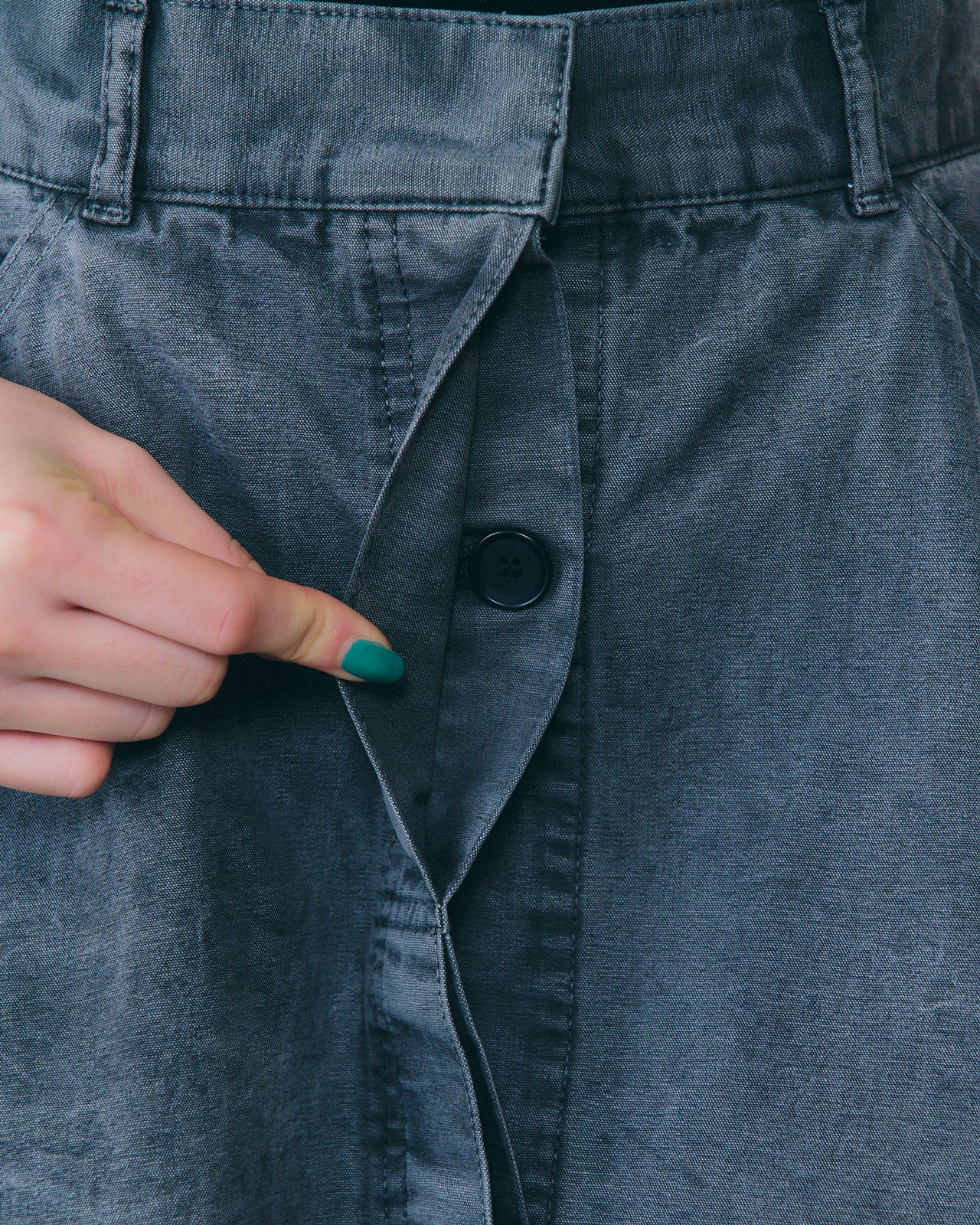 適度なハリ感と独自の風合いを持ち、着るほどに愛着が湧くアイテムです。製品染めによる色むらがヴィンテージ感を演出し、穿き込むことで生地のアタリが出てきます。贅沢に生地を使った存在感のあるフレアシルエットは、動くたびに印象的なシルエットを演出します。前中心は比翼のボタン開き仕様になっています。