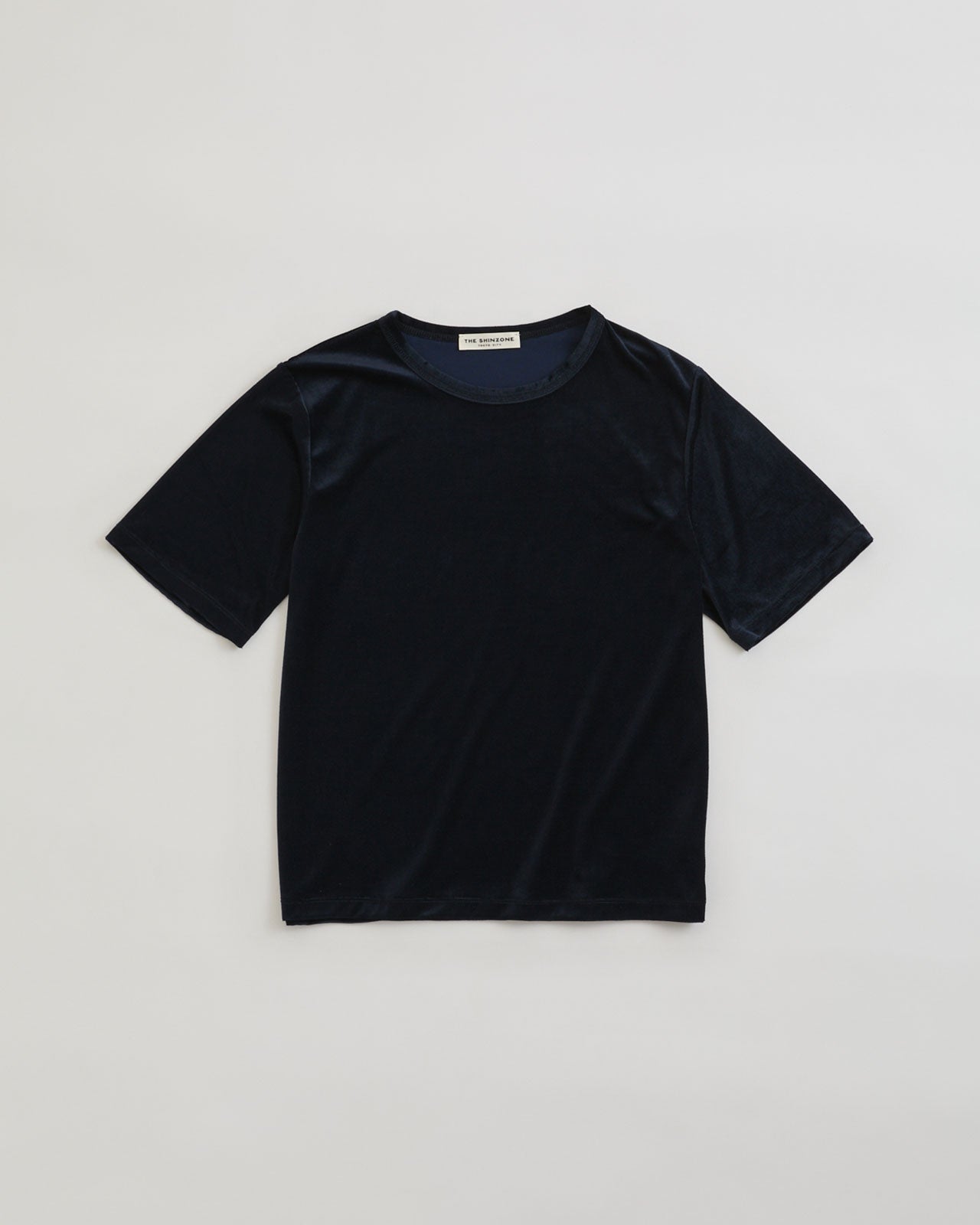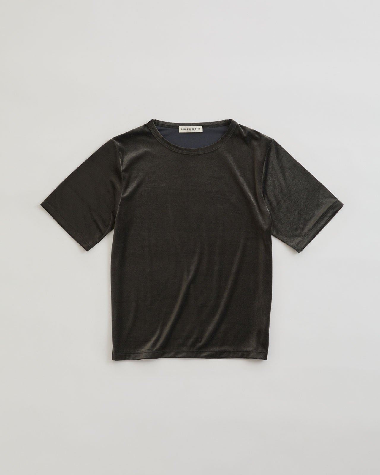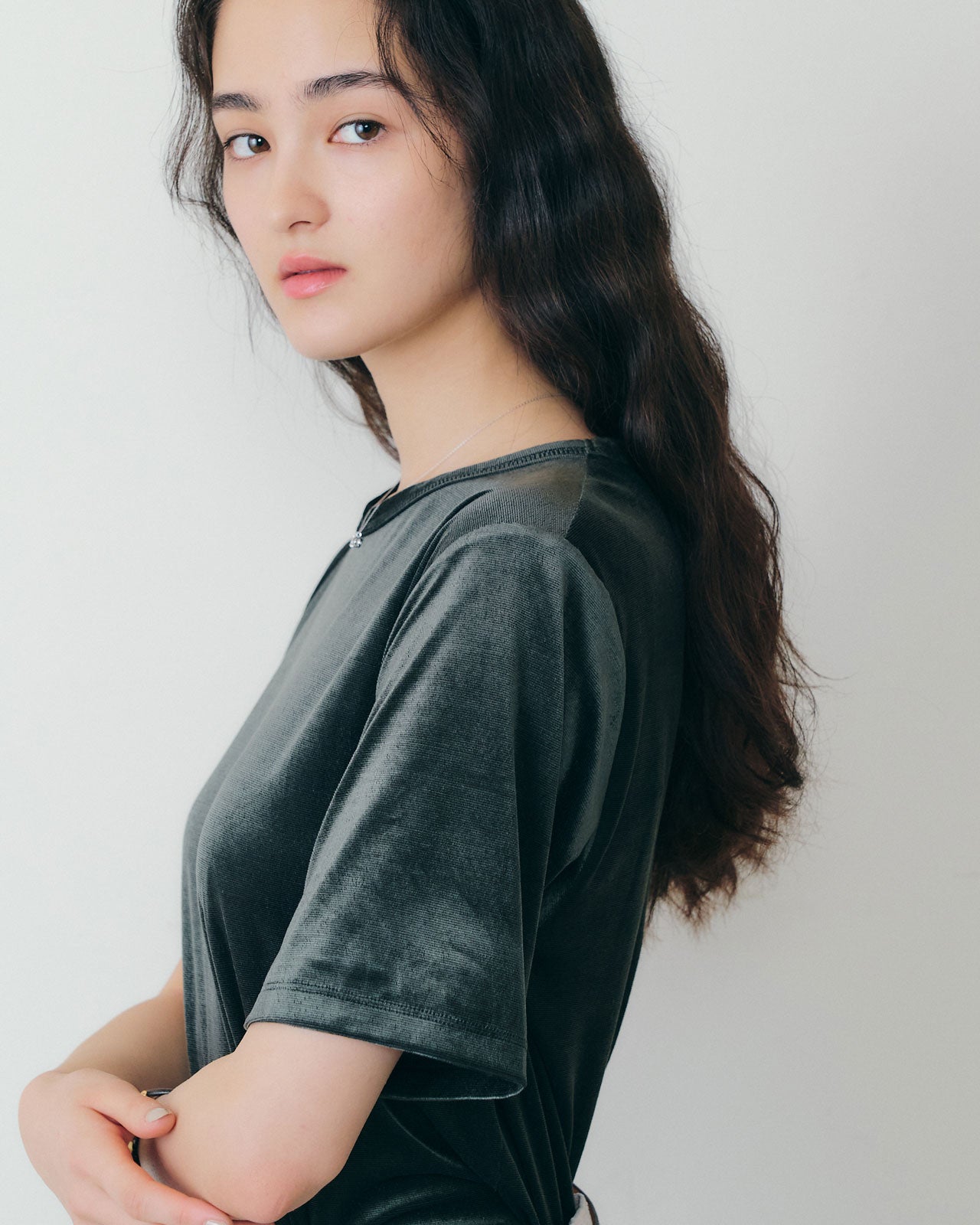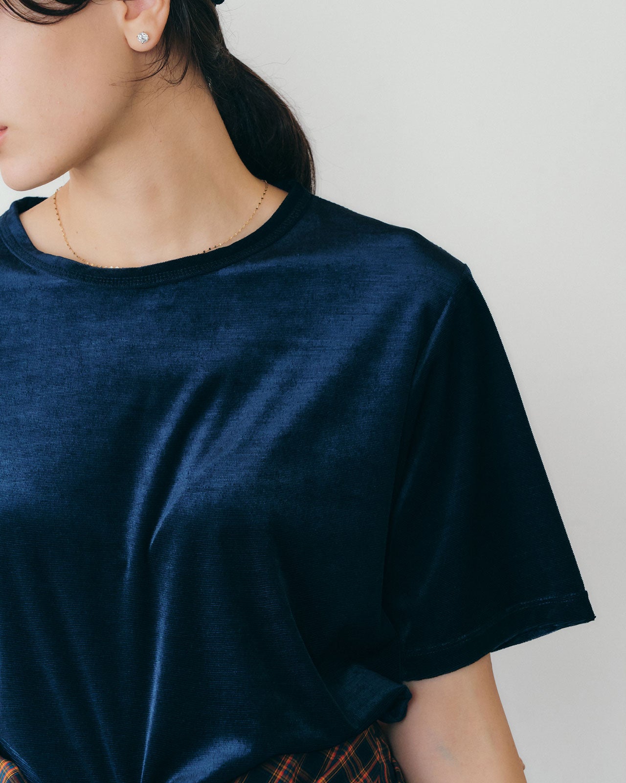 光沢感とドレープ性の高いトリアセテート素材のベロア生地を使用した半袖Tシャツ。 生地の表面が細いボーダーになっているのでメランジ調な見え方になり、大人っぽい上品な光沢感が特徴です。 発色が鮮やかなイエローと、カーキとネイビーの3色展開。 同素材の長袖とのレイヤードコーディネートもおすすめです。