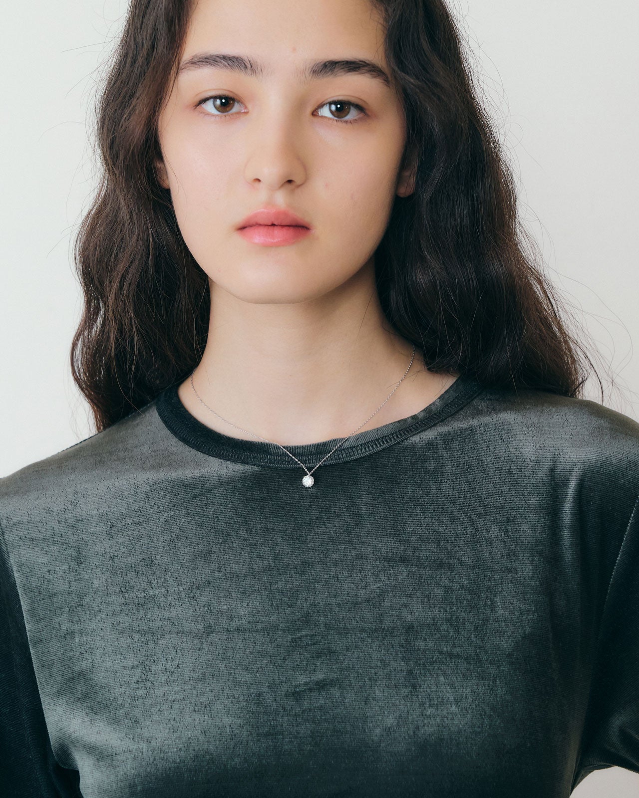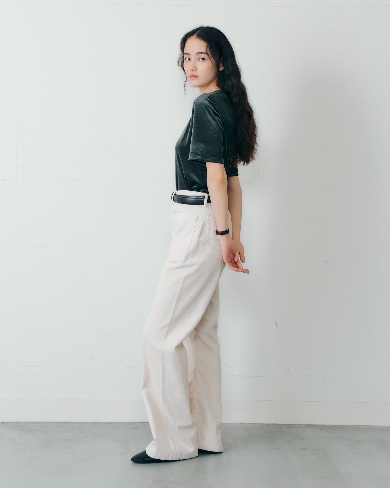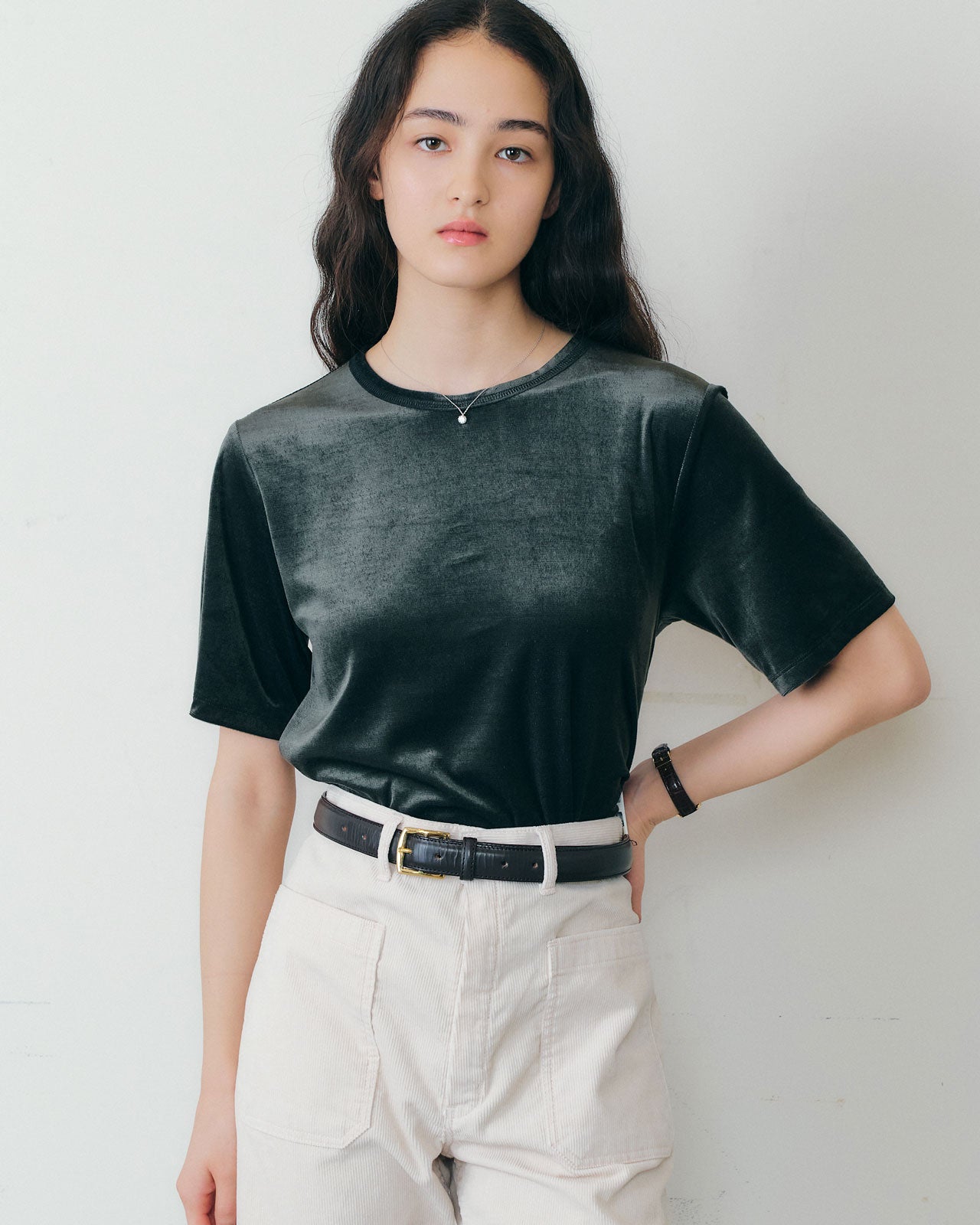 光沢感とドレープ性の高いトリアセテート素材のベロア生地を使用した半袖Tシャツ。 生地の表面が細いボーダーになっているのでメランジ調な見え方になり、大人っぽい上品な光沢感が特徴です。 発色が鮮やかなイエローと、カーキとネイビーの3色展開。 同素材の長袖とのレイヤードコーディネートもおすすめです。