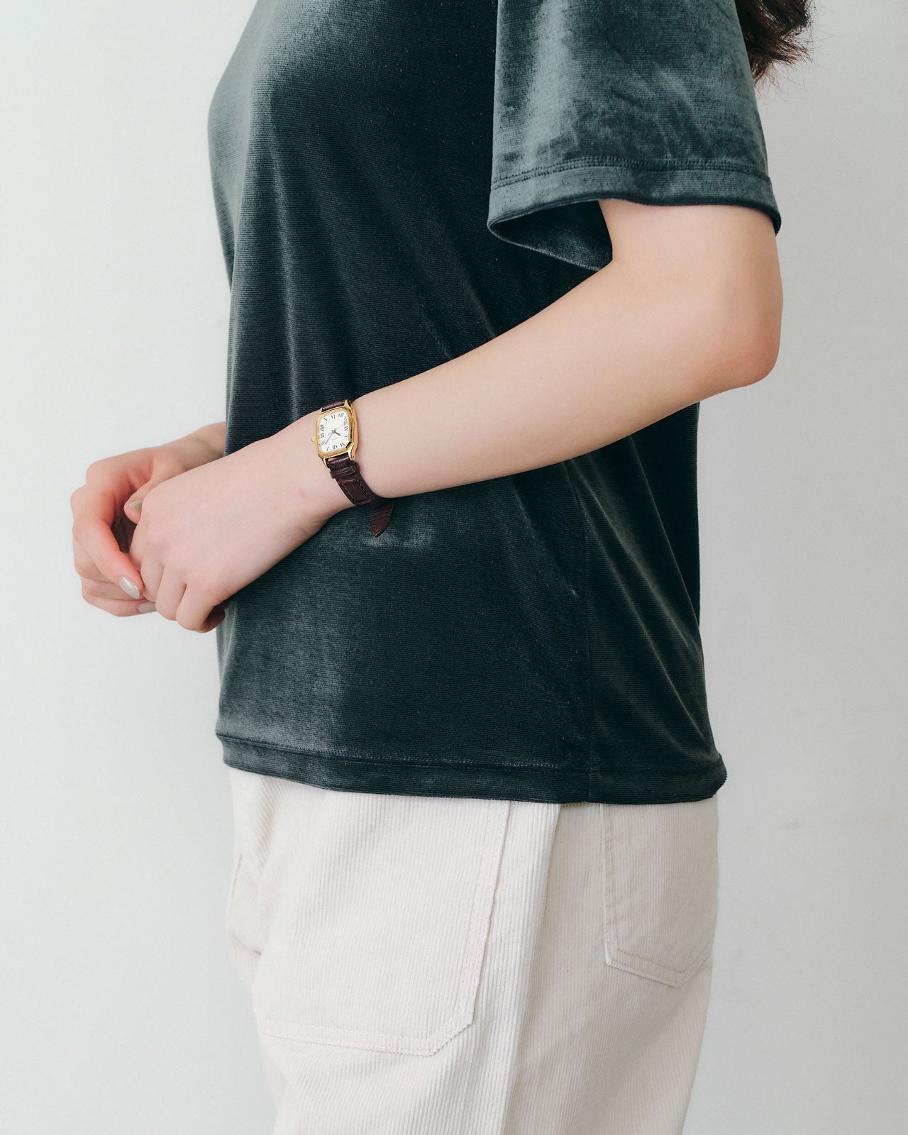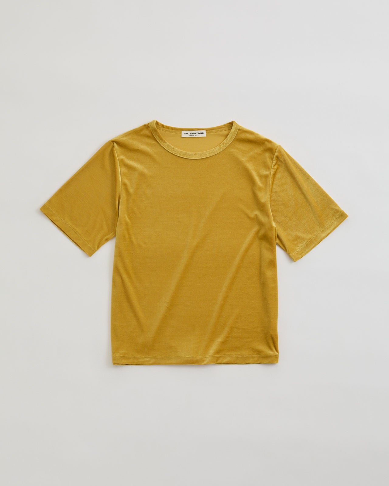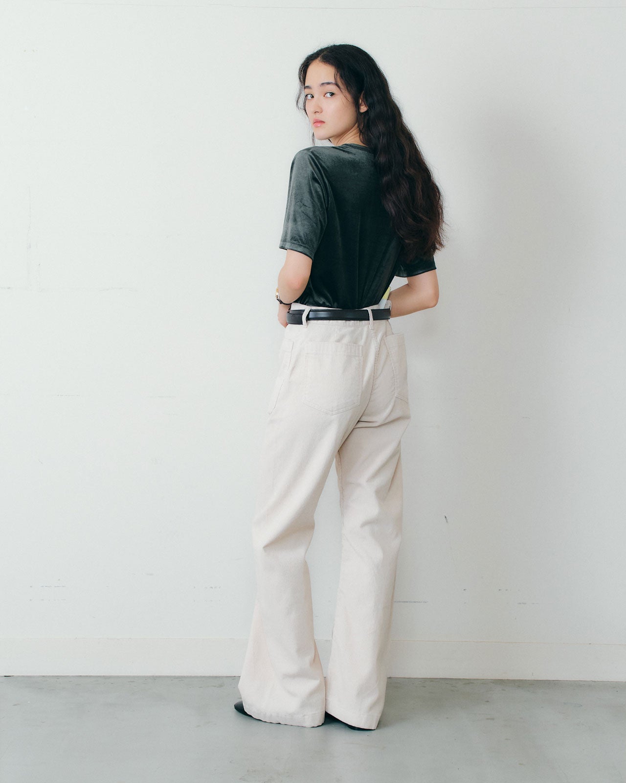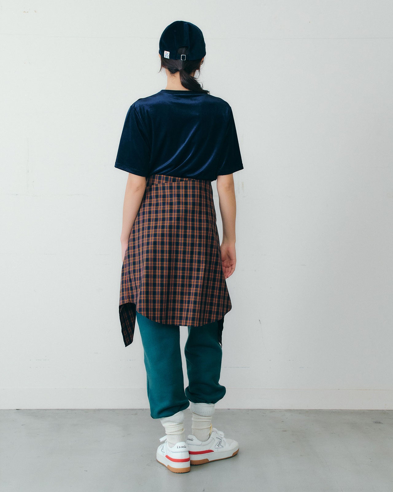 光沢感とドレープ性の高いトリアセテート素材のベロア生地を使用した半袖Tシャツ。 生地の表面が細いボーダーになっているのでメランジ調な見え方になり、大人っぽい上品な光沢感が特徴です。 発色が鮮やかなイエローと、カーキとネイビーの3色展開。 同素材の長袖とのレイヤードコーディネートもおすすめです。