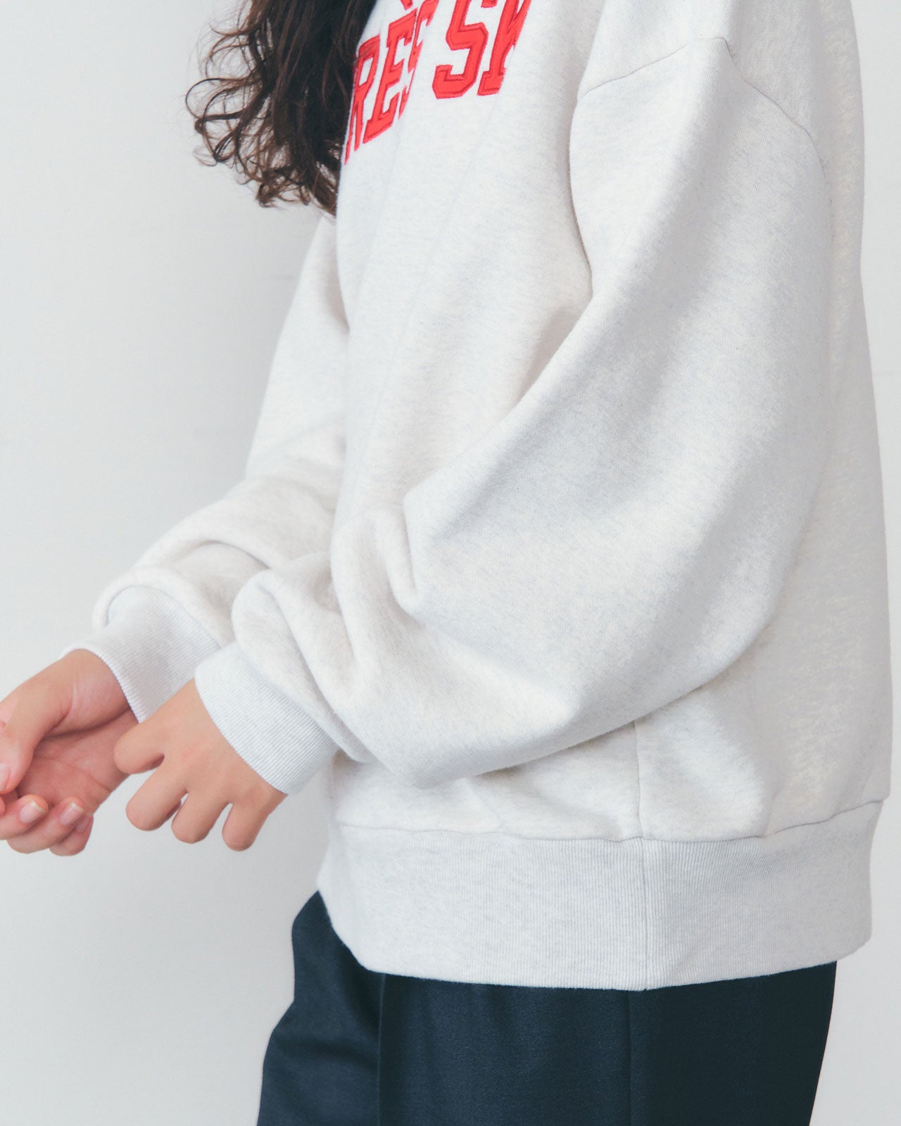 APRÈS SKIとはフランス語でスキーの後を指す言葉です。そんな言葉通り、スキーした後に雪山のロッジでくつろぐときに着てもらえたら、、、そんなことを考えて作ったスウェットです。APRÈS SKIの文字はワッペン風に刺繍し、風を切って滑る様子をイメージして斜めに配置しました。生地は肉厚な30/7フレンチテリーを使用しています。