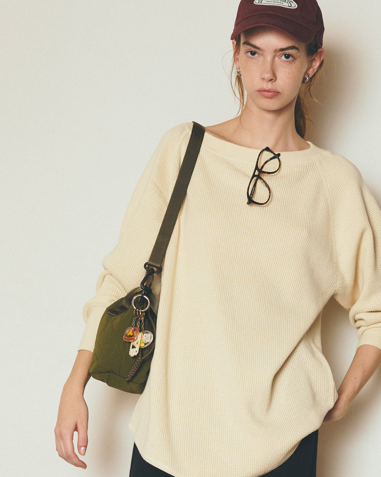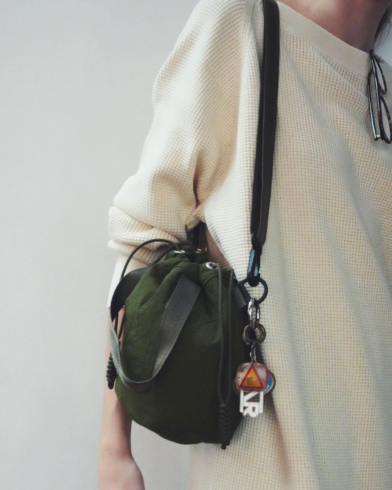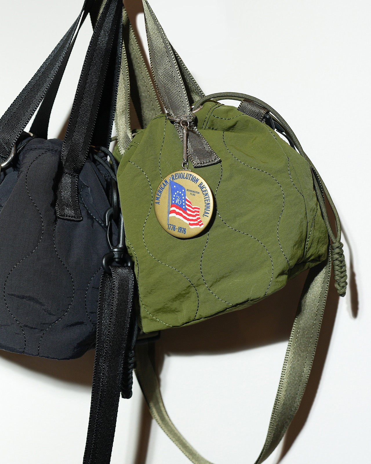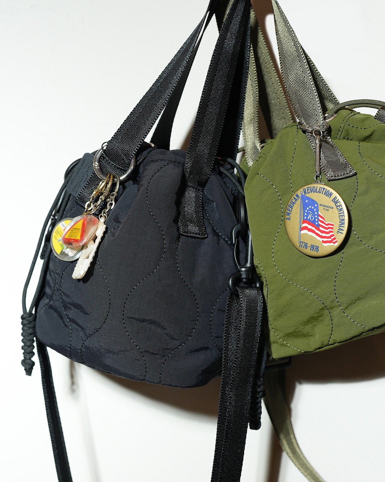 柔らかいナイロンボンディング生地を採用しキルティングを施した、ユニセックスなデザインの巾着バッグ。 ショルダーストラップは取り外し可能。 内ポケットもあり充実した収納を備えています。
