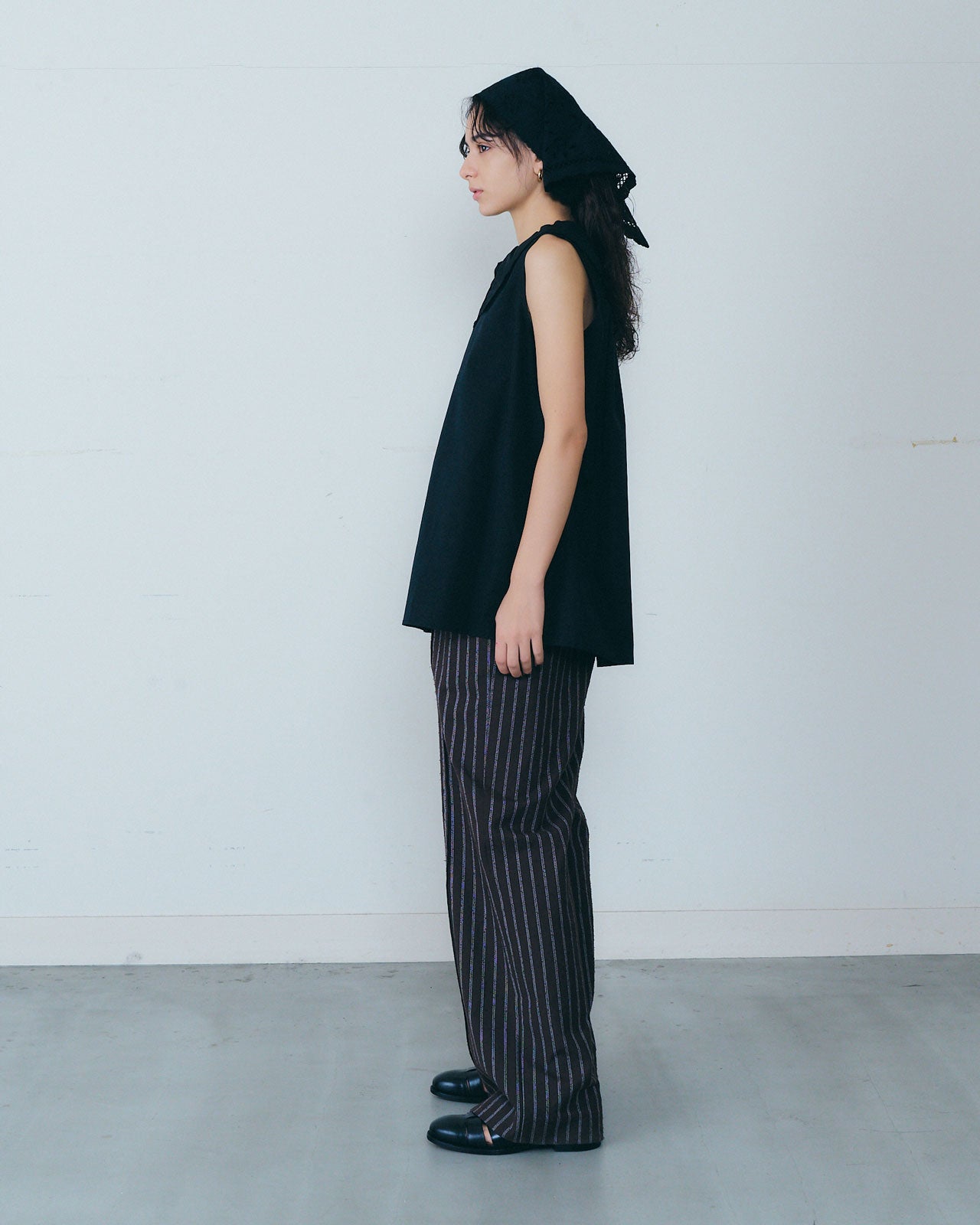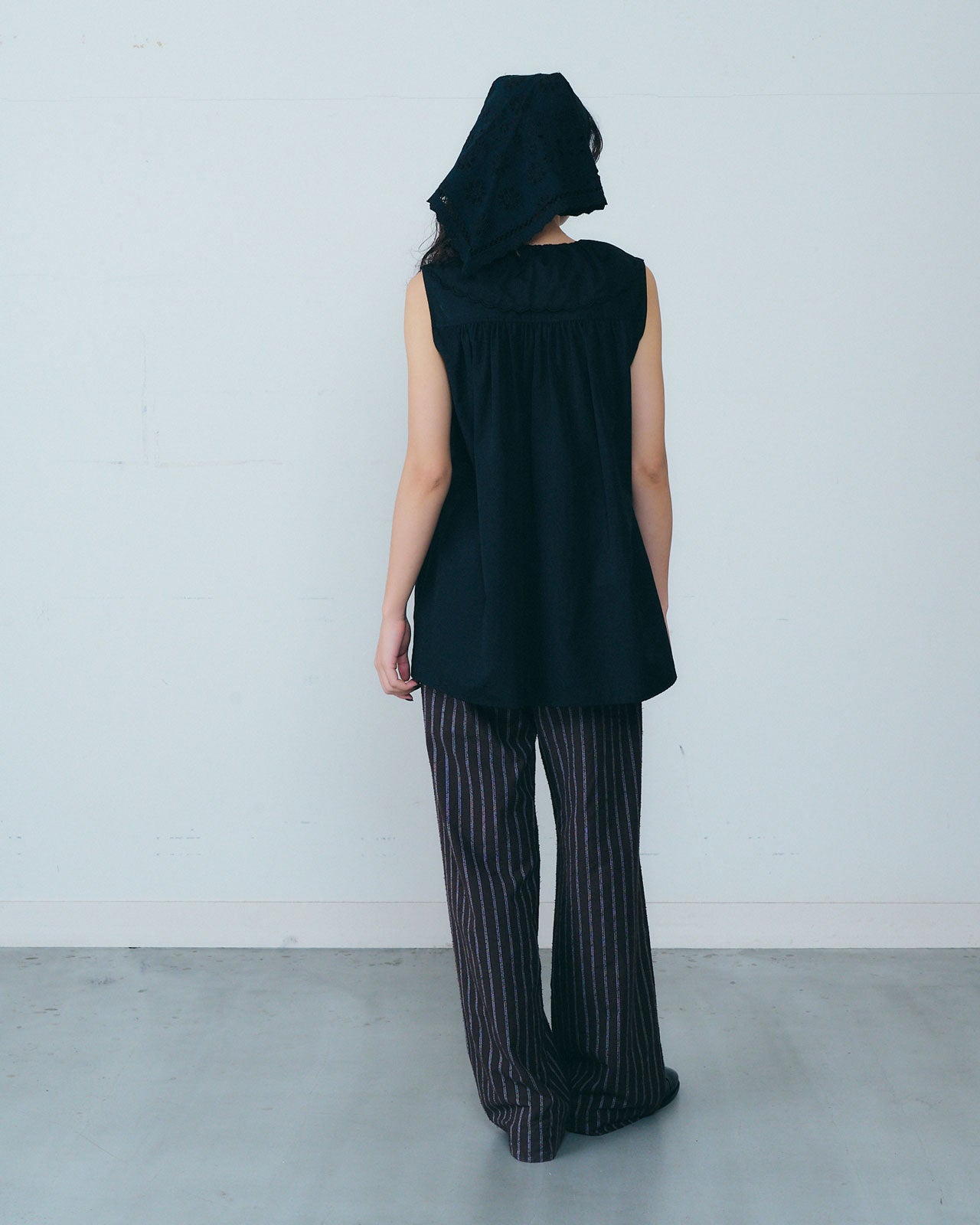 ポルトガルで出会ったヴィンテージレースをインスピレーションにデザインした衿のレースが特徴のノースリーブブラウス。滑らかなスーピマコットン100%素材は、上品な印象を与えます。ギャザーの入ったAラインシルエットがフェミニンさを引き立て、大人のカジュアルスタイルに華やかさをプラスします。カーディガンやスウェットなどを羽織って、衿だけ見せるスタイルもおすすめです。