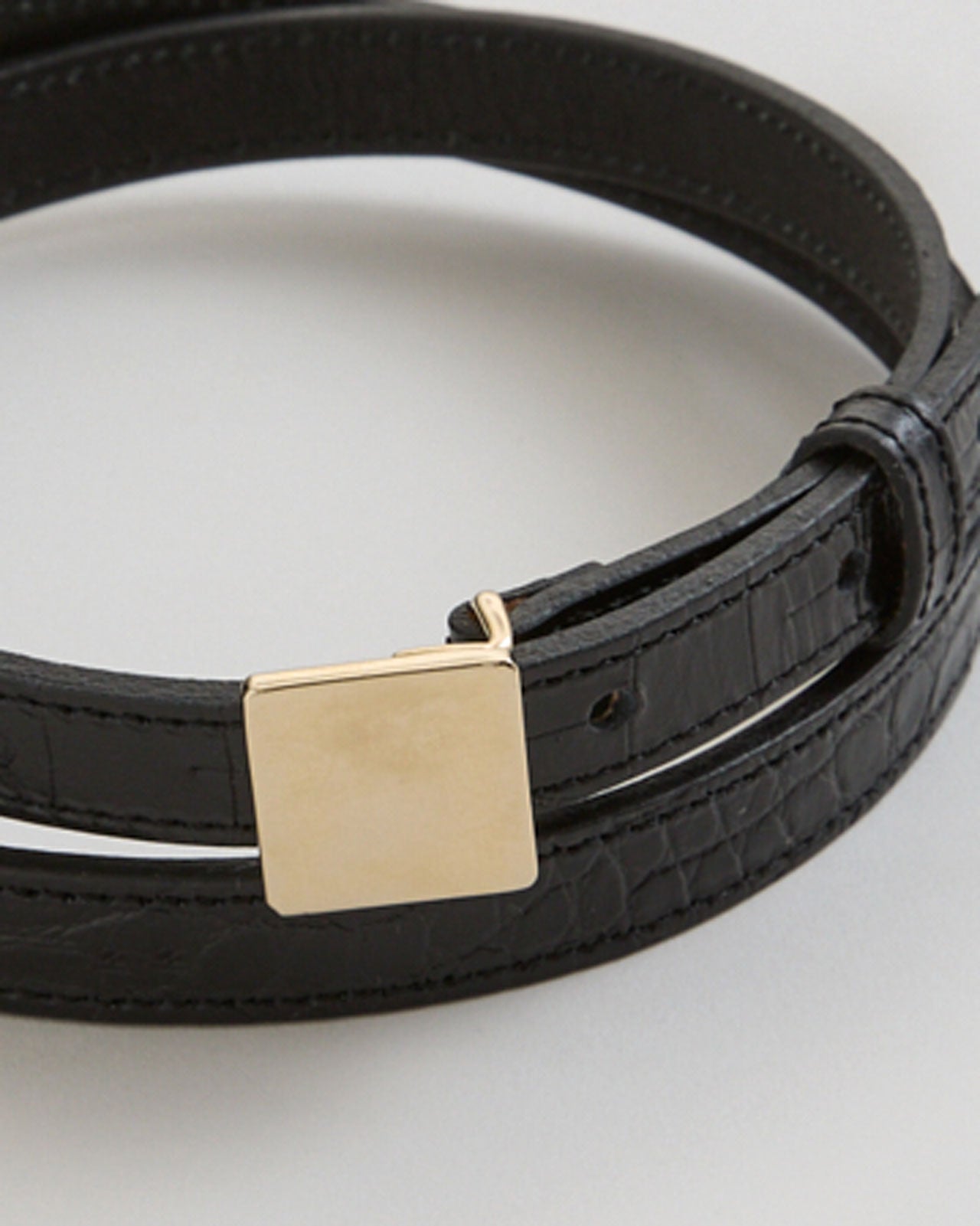 ゴールドのスクエアー型バックルが目を引く新型ベルト。クロコダイル風の柄を型押しした牛革を使用しています。細巾のベルトなので、ウエストマークも華奢な印象にしてくれます。