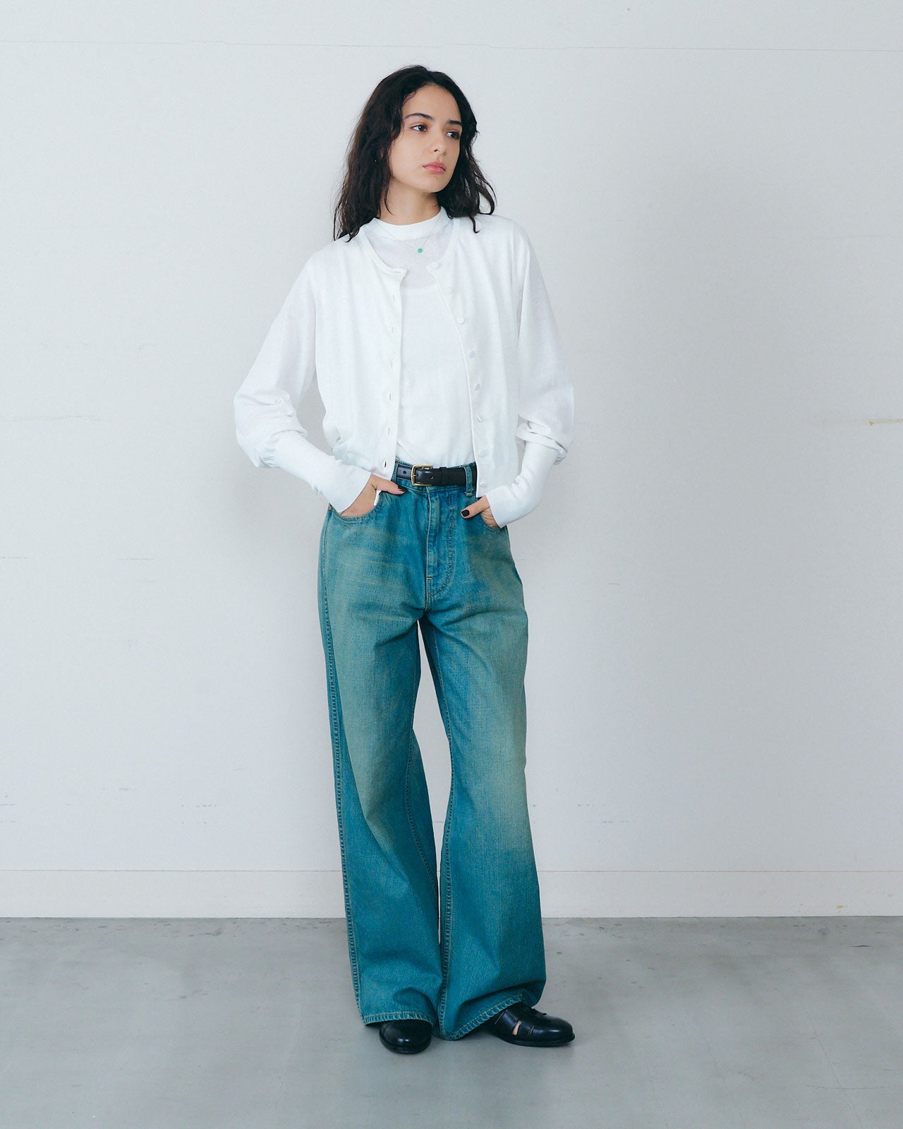 ガス焼き加工によって毛羽立ちが抑えられ、さらにシャープで洗練された風合いに仕上がっています。植物性の油脂が適度に含まれているため、滑りのある光沢が特徴で、別注の追撚加工によりさらりとした肌触りで快適な着心地を実現しています。袖口はリブが長めにデザインされており、ボタンは見頃と同じ編み地でくるみボタンに仕上げています。同素材のノースリーブと合わせてアンサンブルスタイルを楽しむのもおすすめです。1枚でも重ね着でも活躍するアイテムです。