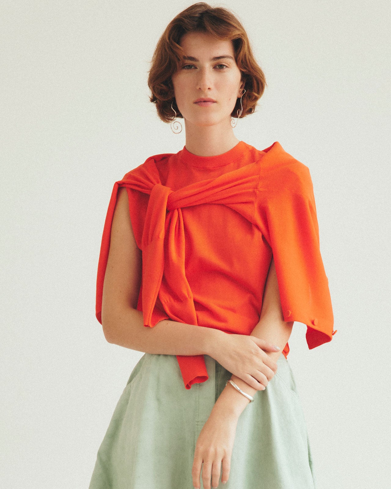 ガス焼き加工によって毛羽立ちが抑えられ、さらにシャープで洗練された風合いに仕上がっています。植物性の油脂が適度に含まれているため、滑りのある光沢が特徴で、別注の追撚加工によりさらりとした肌触りで快適な着心地を実現しています。ボタンは見頃と同じ編み地でくるみボタン仕様にしています。前開きのデザインですが、前後逆にしても着用可能です。スタイルに応じて様々なアレンジが楽しめます。同素材のカーディガンと合わせて、アンサンブルスタイルもおすすめです。