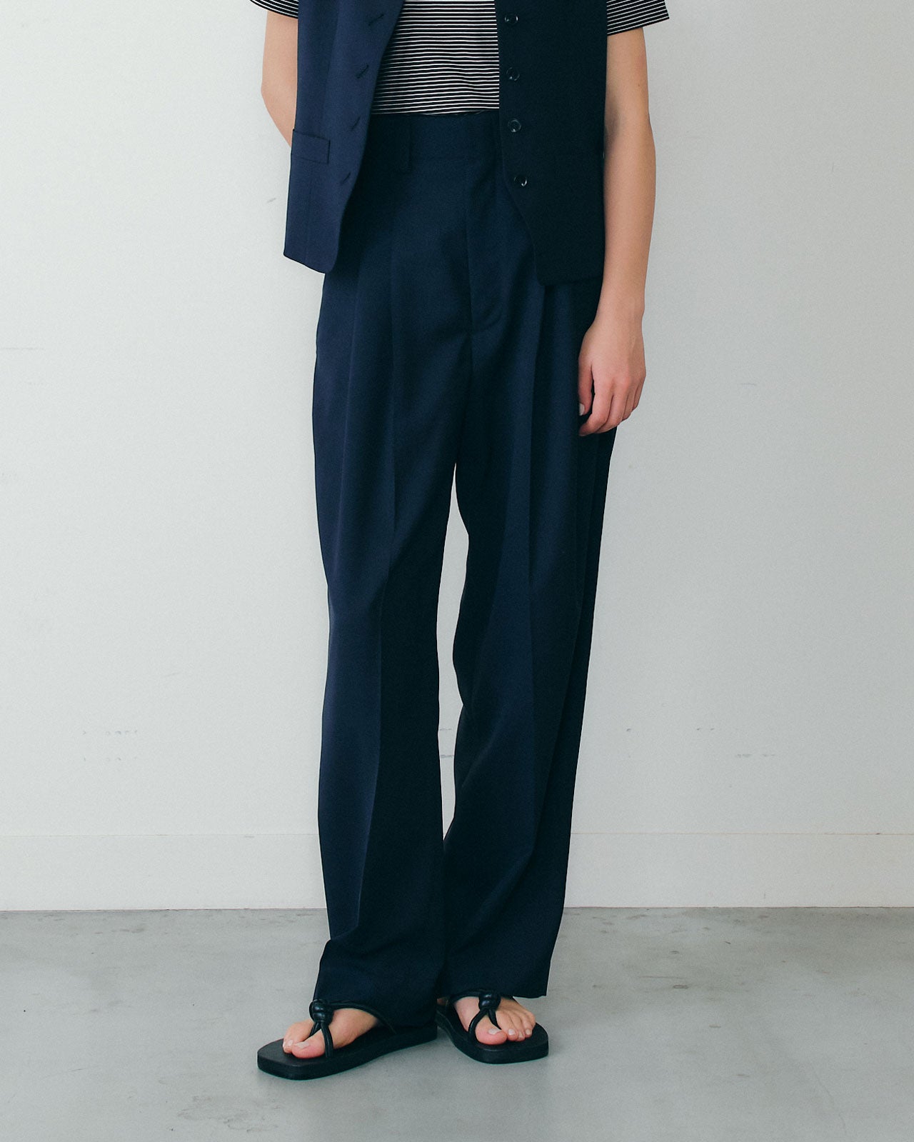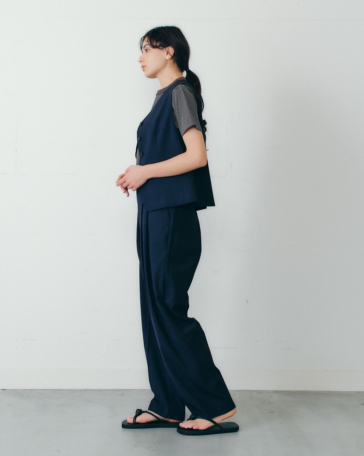 いつものカジュアルな印象と違って上品な雰囲気に。ウールの産地尾州で織られたポリエステルウールの平織り生地を使用しています。梳毛のさらっとした手触りは夏にもぴったりな素材感です。同素材のジレとセットアップで着用していただくのもオススメ。杢調のブラウン(カラー表記:GRAY)と深めのネイビーの2色展開です。
