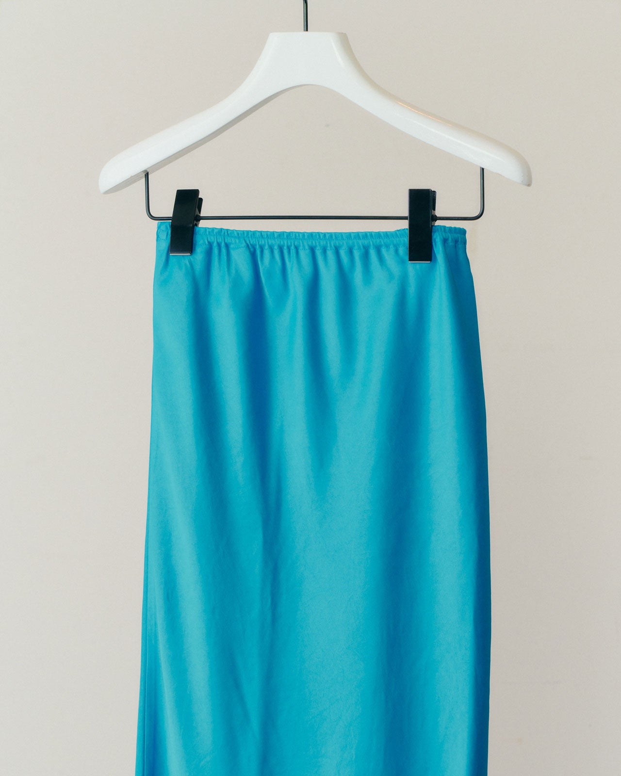 地球環境に配慮した持続可能なアセテート糸を使用しており、濡れたような控えめな光沢感としなやかなドレープ性が特徴的な生地をバイアス使いすることで、フィット感と落ち感のあるシルエットを生み出しています。どんなトップスとも相性が良く、お気に入りのTシャツやブラウスとコーディネートしてください!ウエストはゴム使用です。真っ青な空のようなブルーと、上品なブラックの2色展開です。