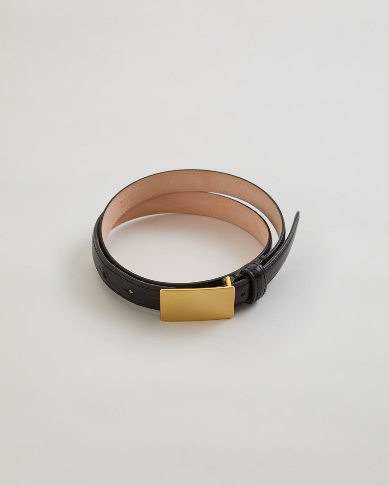 やや細身のシグネットベルトはマット加工を施した24Kのバックルが特徴。