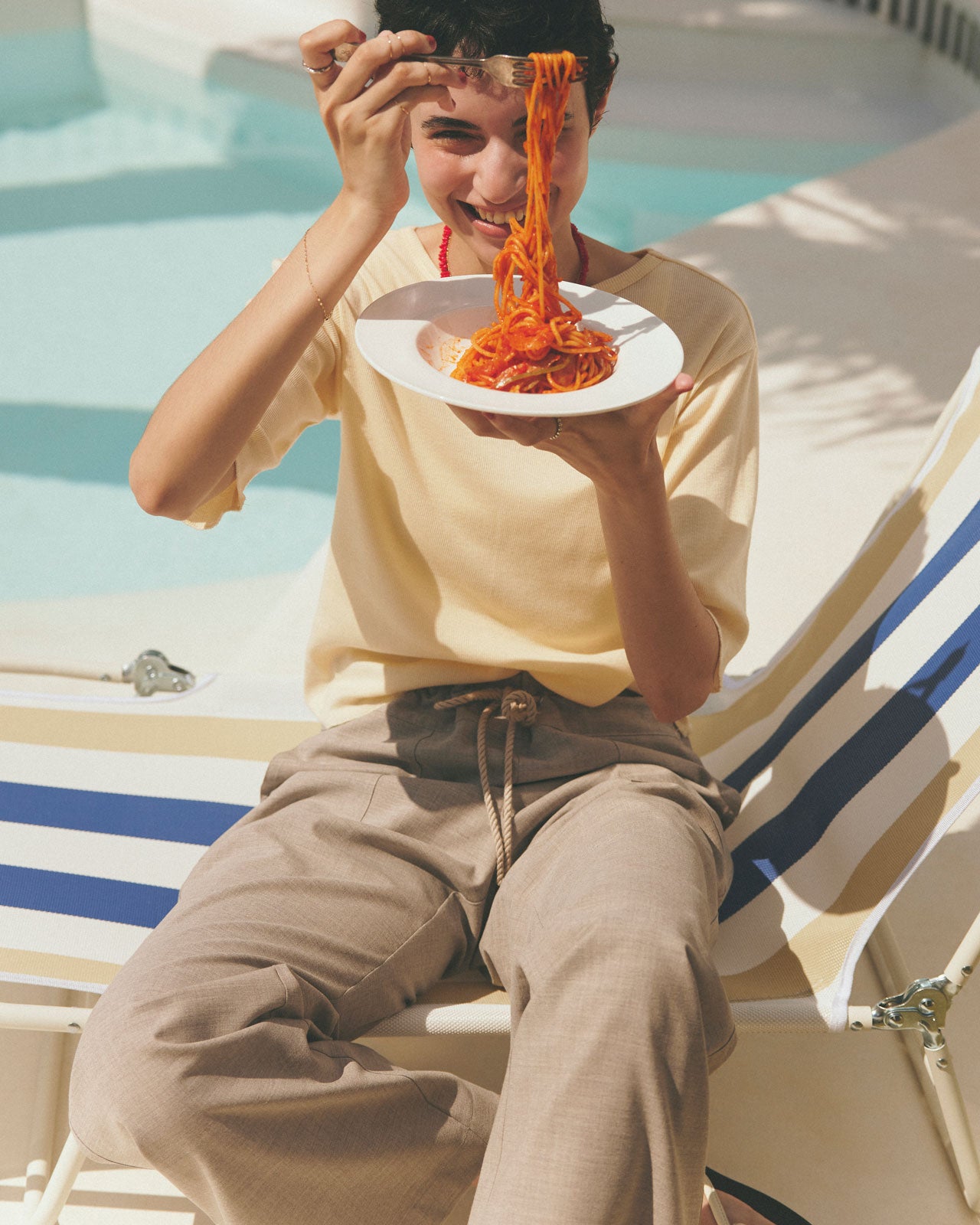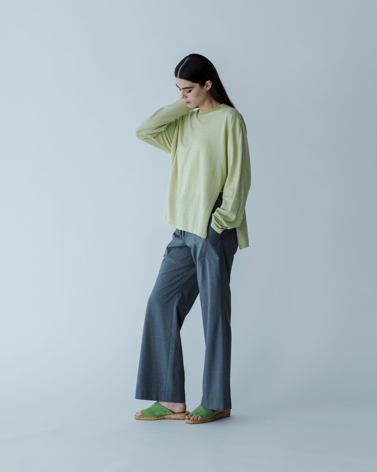 スラックスの良いところはラフなTシャツを合わせてもカジュアルになりすぎず、上品な雰囲気にしてくれるところです。 素材はサラッとした快適な肌触り、少しストレッチも入っていて快適な着心地。そして夏に特に大事なのが洗えるかどうかです。安心してください。洗えます。ハイウエストでもジャストウエストでも脚を綺麗に見せてくれるシルエット。綺麗な形の秘訣はウエストをギュッと絞ることでパンツのラインがフレアになることです。