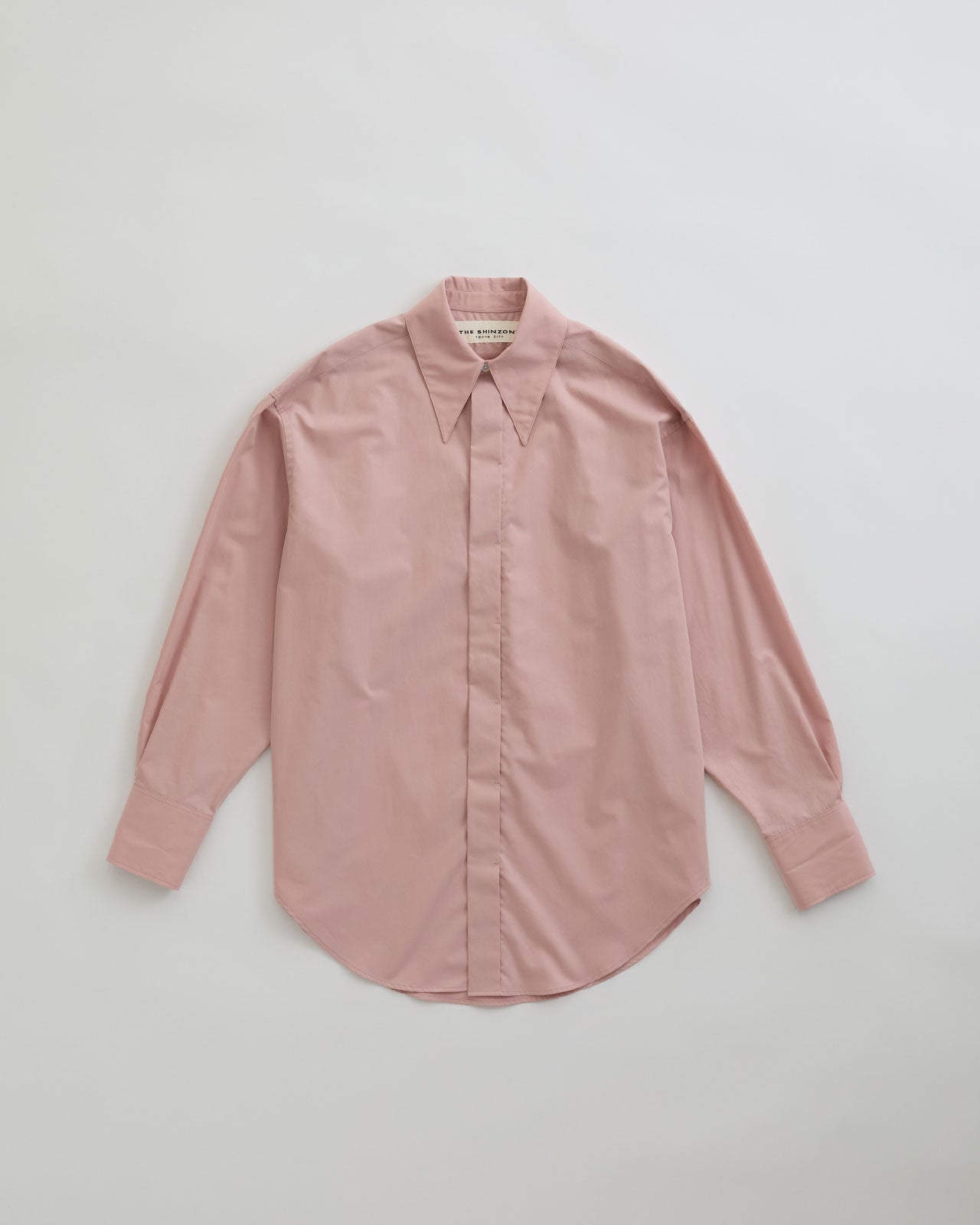 オリジナルのシャンブレーポプリン生地を使用したシャツです。コットン100%の平織ながら、柔らかさと光沢感を実現しました。経(たて)と緯(よこ)で色を違う糸を使用したことで、独特の光沢感を放ちます。ポインテッドカラーに、ボタンを隠した比翼仕立てでのデザインが上質なムード。オーバーサイズでこなれた大人のカジュアルを実現する1枚です。