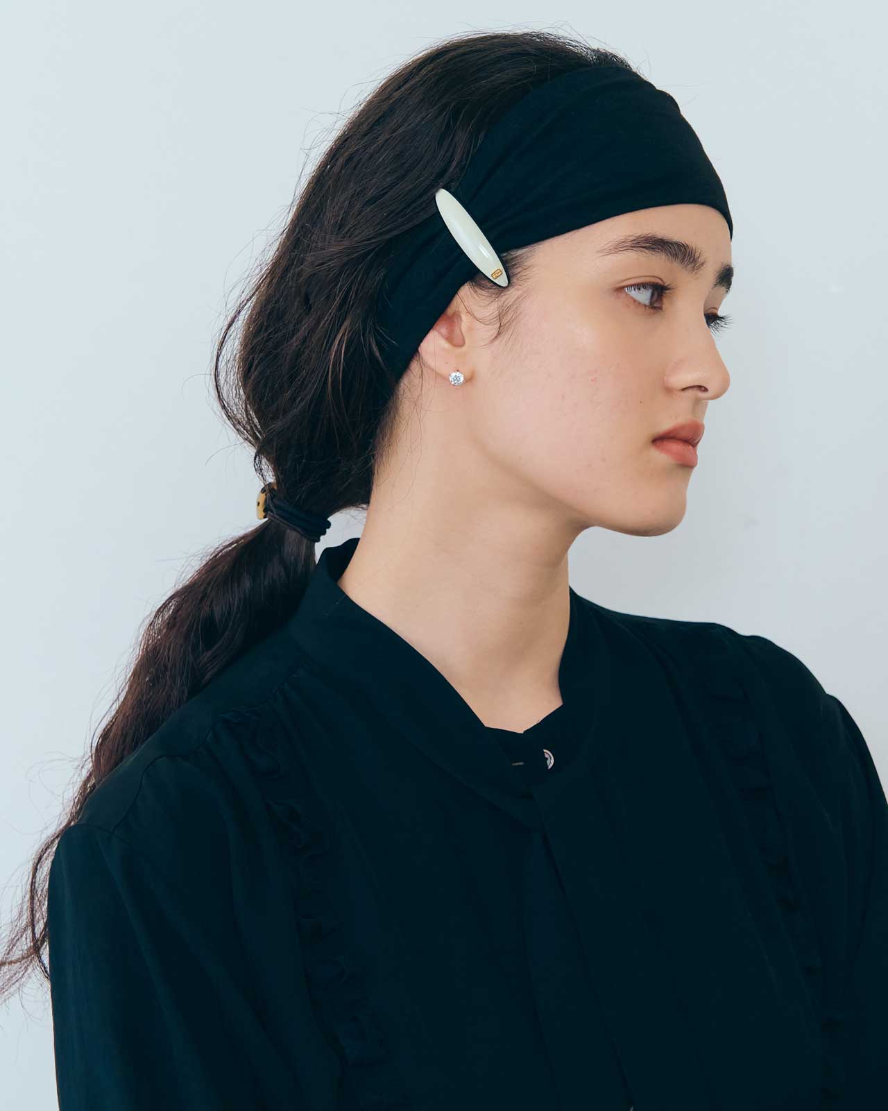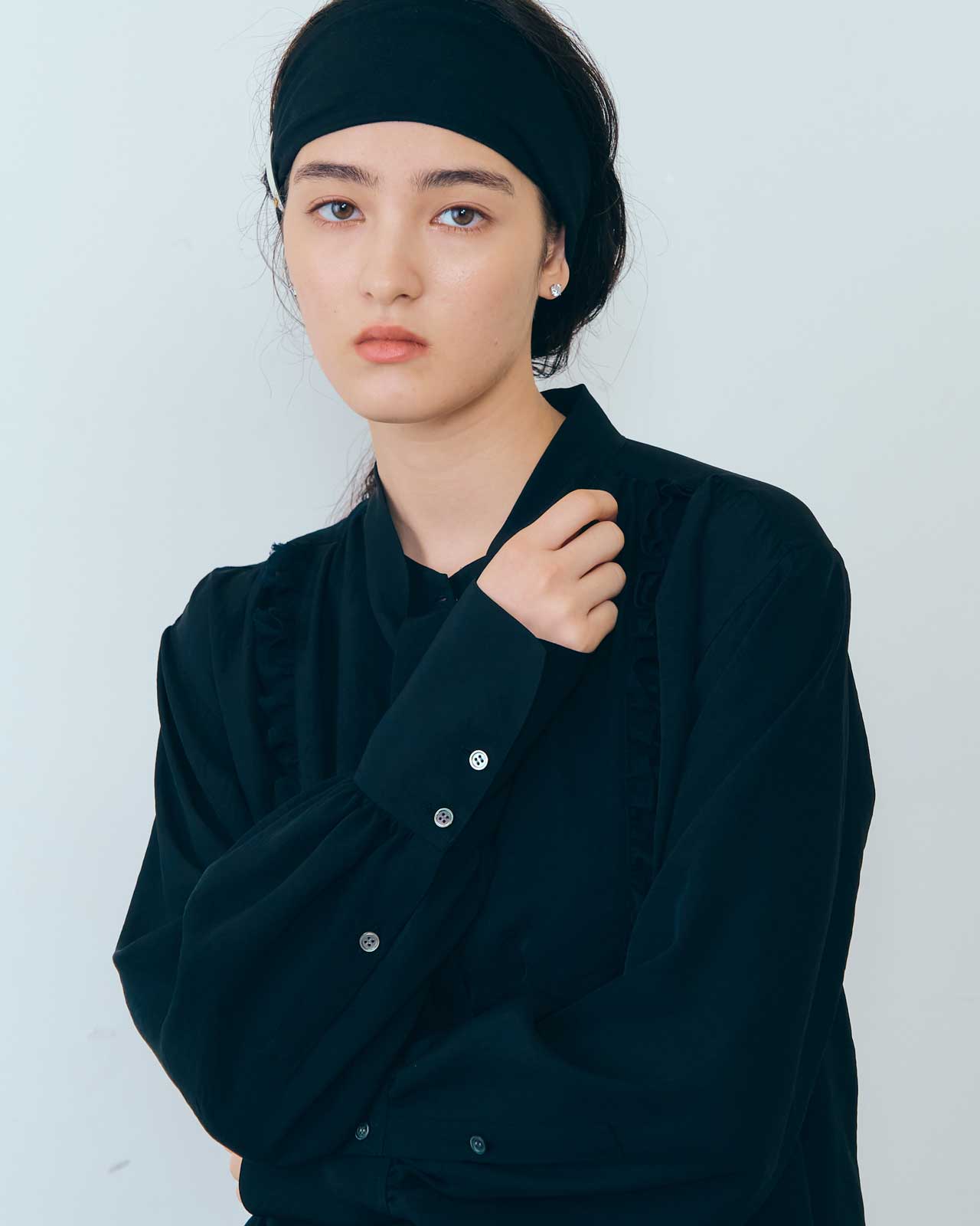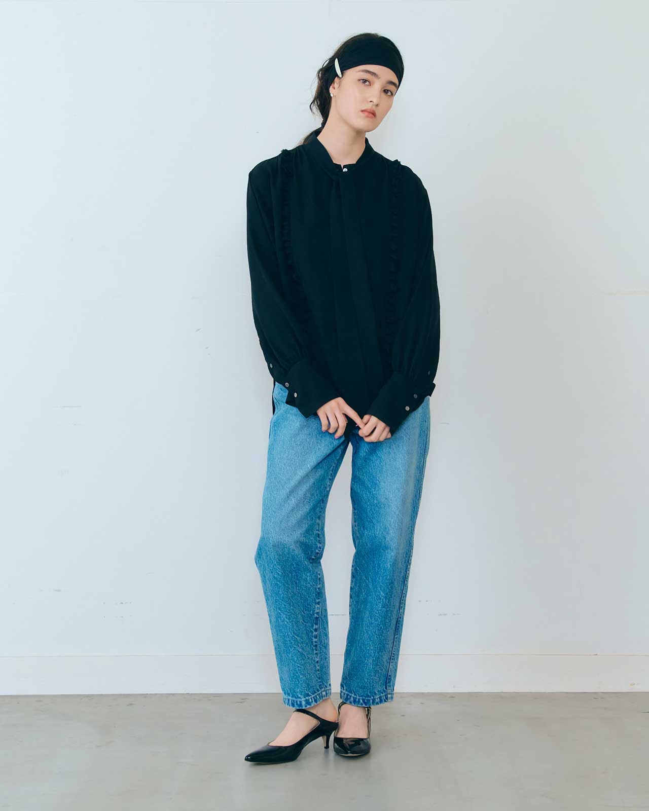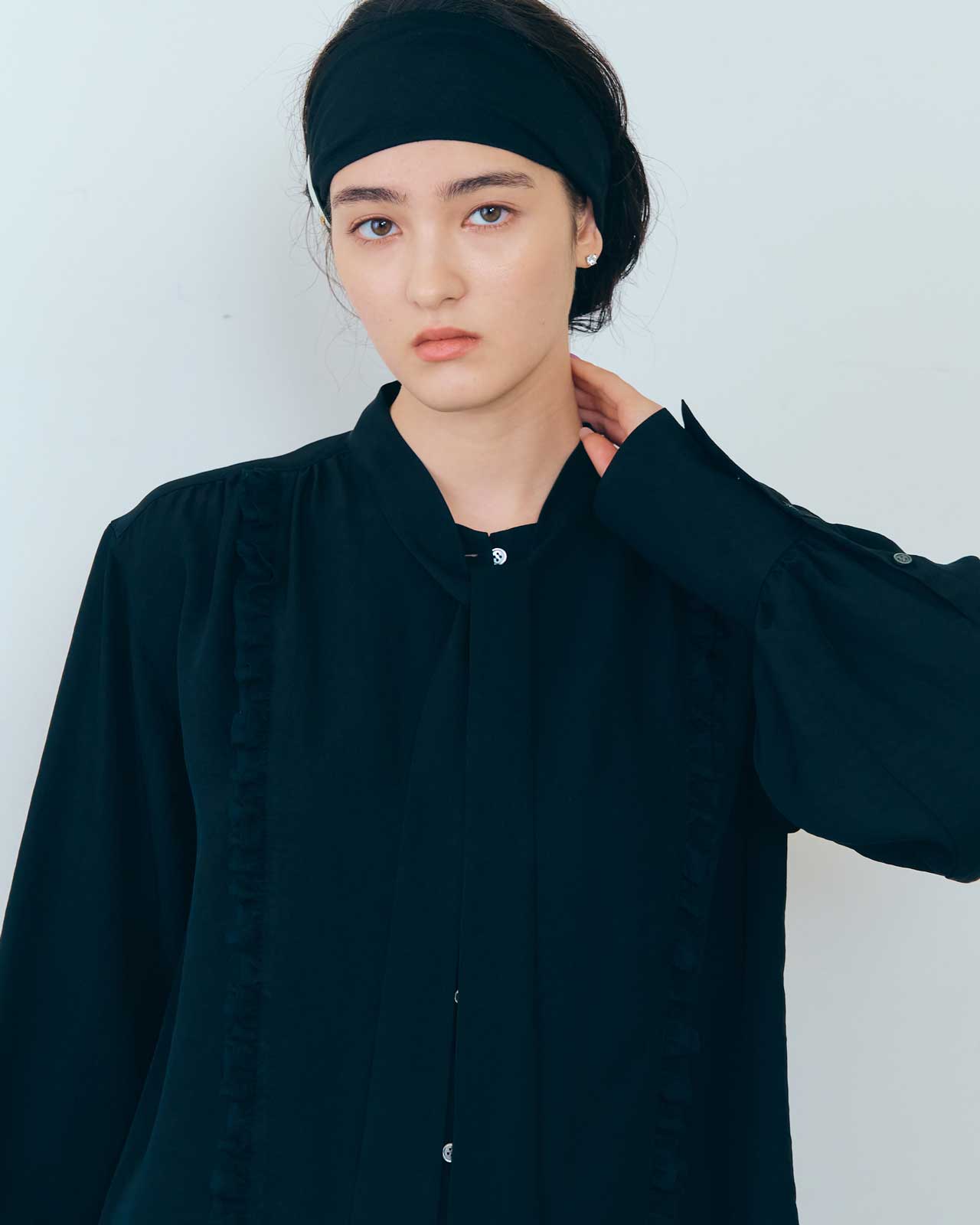 撚糸したアセテート100%ツイル素材を使用。程よい光沢感と落ち感、さらに細かいシワ感が絶妙な抜け感とカジュアルなムードを演出。スタンドカラーにヨーク切り替えを加え、さらに袖口にはふんだんなギャザーをプラスしました。同素材のフリルには、コットンボイルの断ち切りを使用することで、コントラストと抜け感が生まれました。オケージョンはもちろん、デニムに合わせてデイリーにもお楽しみいただける、使えるリボンブラウスです。