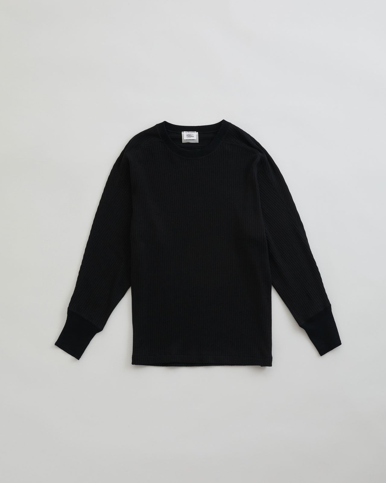 オリジナル生地を使用したTシャツです。ブークレの糸で編んだランダムリブ仕様。スウェーデン軍のアンダーシャツを参考に、生地を今っぽく表現しています。奥行き感のある生地に、袖口の編み立て、さらに裾のステッチを赤色にするなどディテールにこだわり抜いた1枚です。