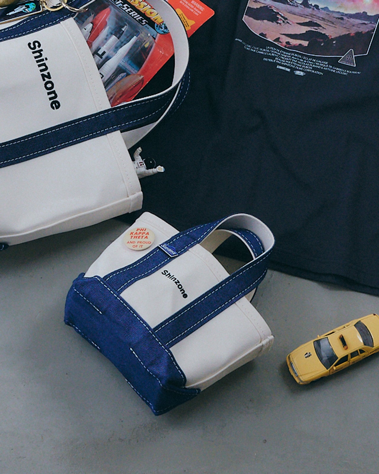 使い込むほどに生地が柔らかくなり味がでてきます。ハンドルはシンゾーンらしいインディゴカラーを選びカジュアルな印象に。 PETITEは、バッグインバッグとしても使え、ランチやお散歩など気軽に持ち運びができるキュートなサイズ感です。 キーホルダーやピン、バッジなどを付けて持つのもおすすめです。