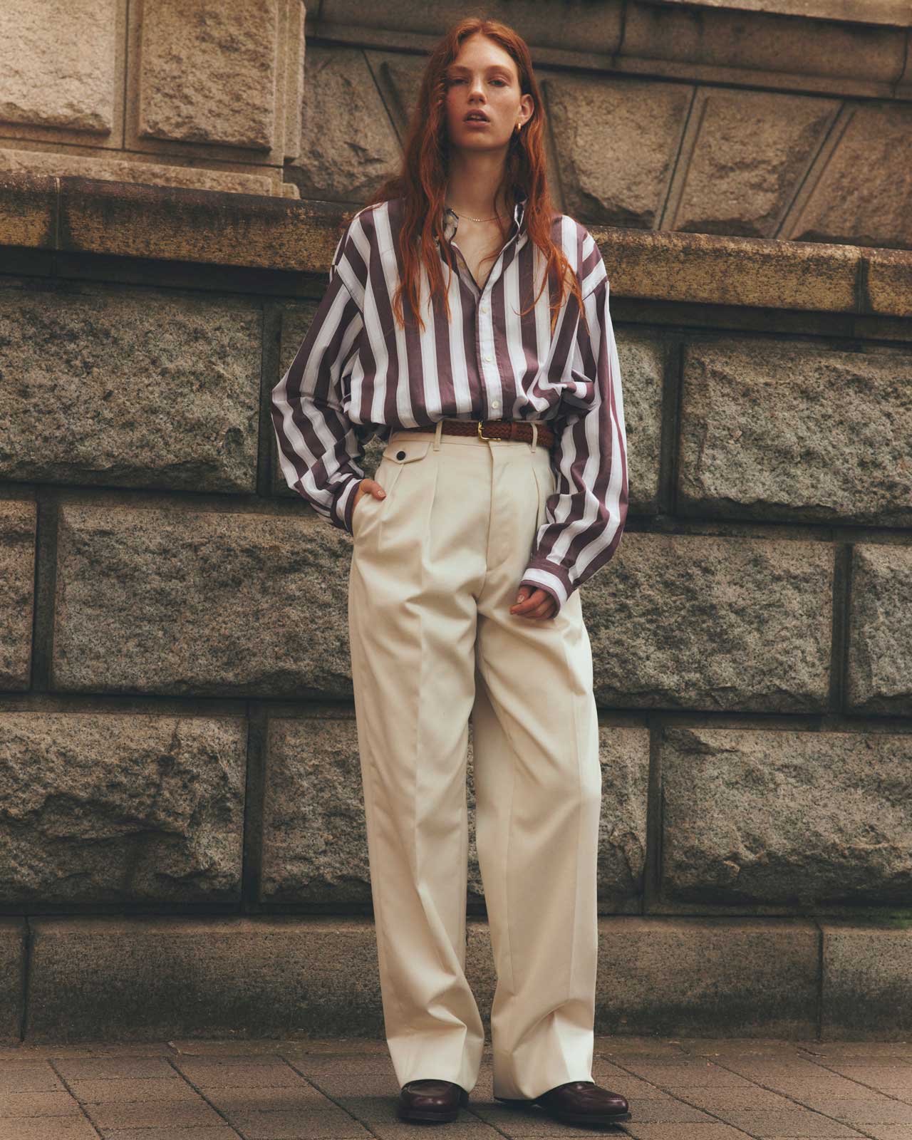 高級感がありながら、こなれた感じを醸す生地のため、1本で着こなしに程よい抜け感を演出します。カラーは「アメリカの富裕層の男の子が履いているパンツ」をイメージしたアイボリー。またコインポケットを前身頃にあしらいました。テーパードの股上深めのセンタープレス仕様のため腰でゆったりと、もしくは、ベルトでウエストを絞ってジャストで履いても○。DADDY SHIRTと合わせてShinzone流ニュープレッピールックをお楽しみください。