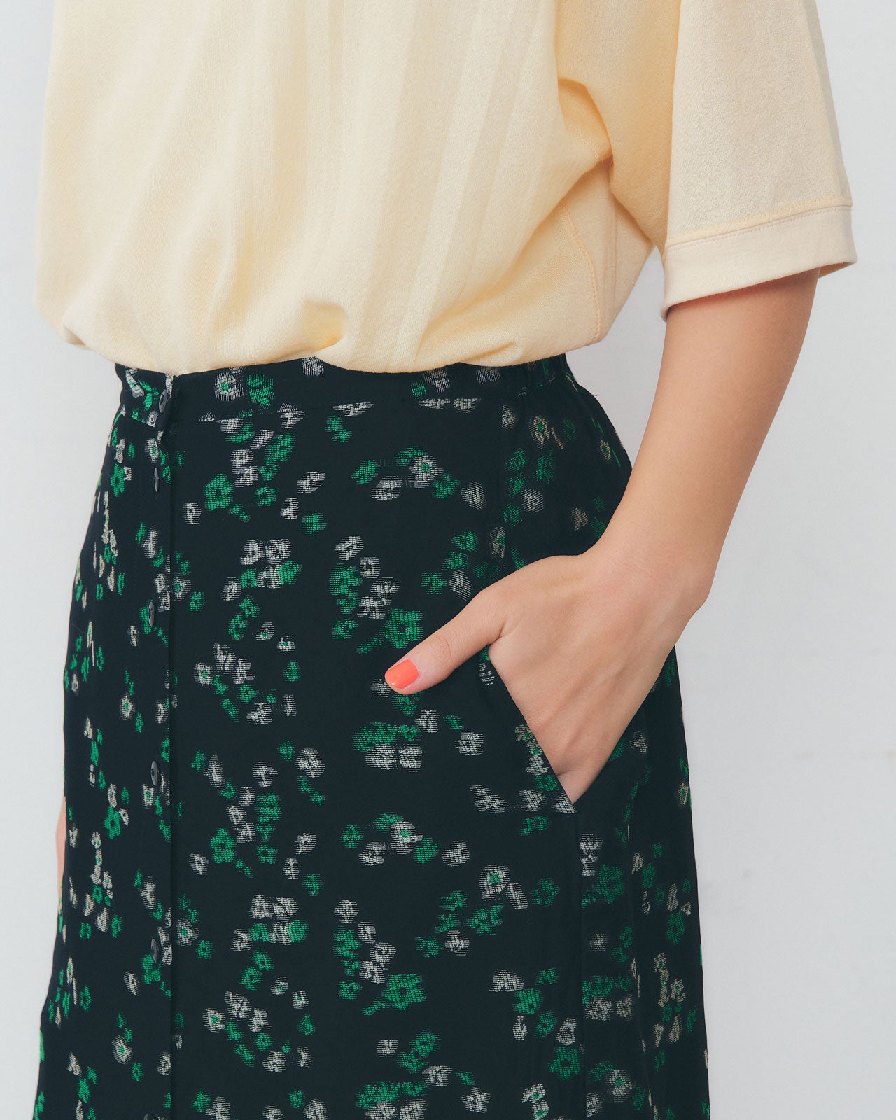 桐生の伝統技術を用いたレーヨン素材のジャガード生地を使用。軽やかで透け感のある涼しげな表情が魅力です。 オリジナルの上品なグリーンの小花柄と、後ろウエストをゴム仕様で仕上げたでリラックスした穿き心地が爽やかな夏のおしゃれを演出。 センターフロントのボタンを外して、パンツとのレイヤードスタイルも楽しめます。