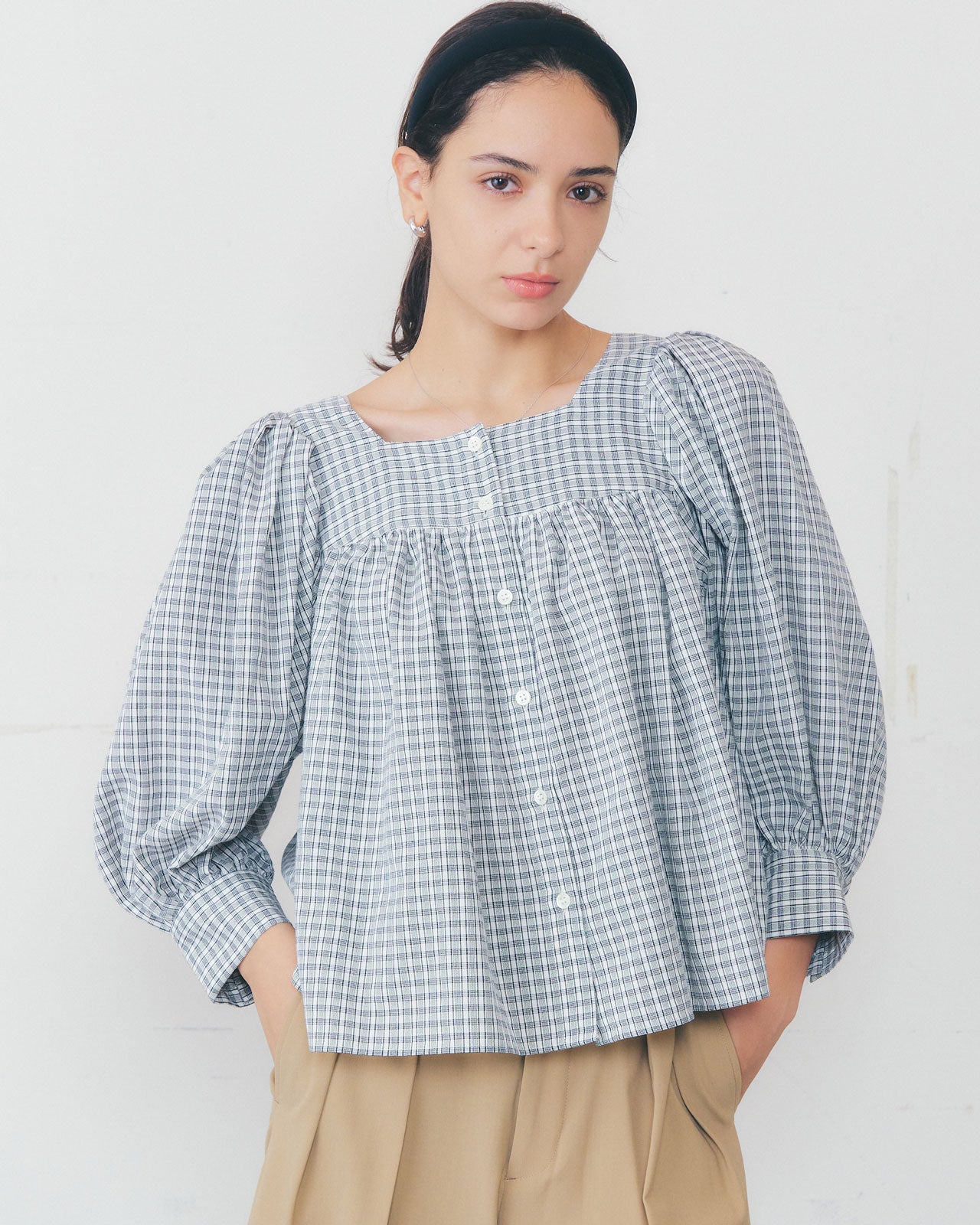 袖にたっぷりギャザーを入れ、ふんわりと華やかな印象に仕上げています。 デコルテを美しく見せるすっきりとした襟ぐりのカッティングもポイント。素材には80年代のアーカイブ生地を現代の技術でリメイクしたブランドオリジナルのチェックを使用。複雑なドビー織りとこだわりの色合いで上品なムードをプラスしています。 一枚で夏の華やかなスタイリングが完成し、羽織としても活躍します。