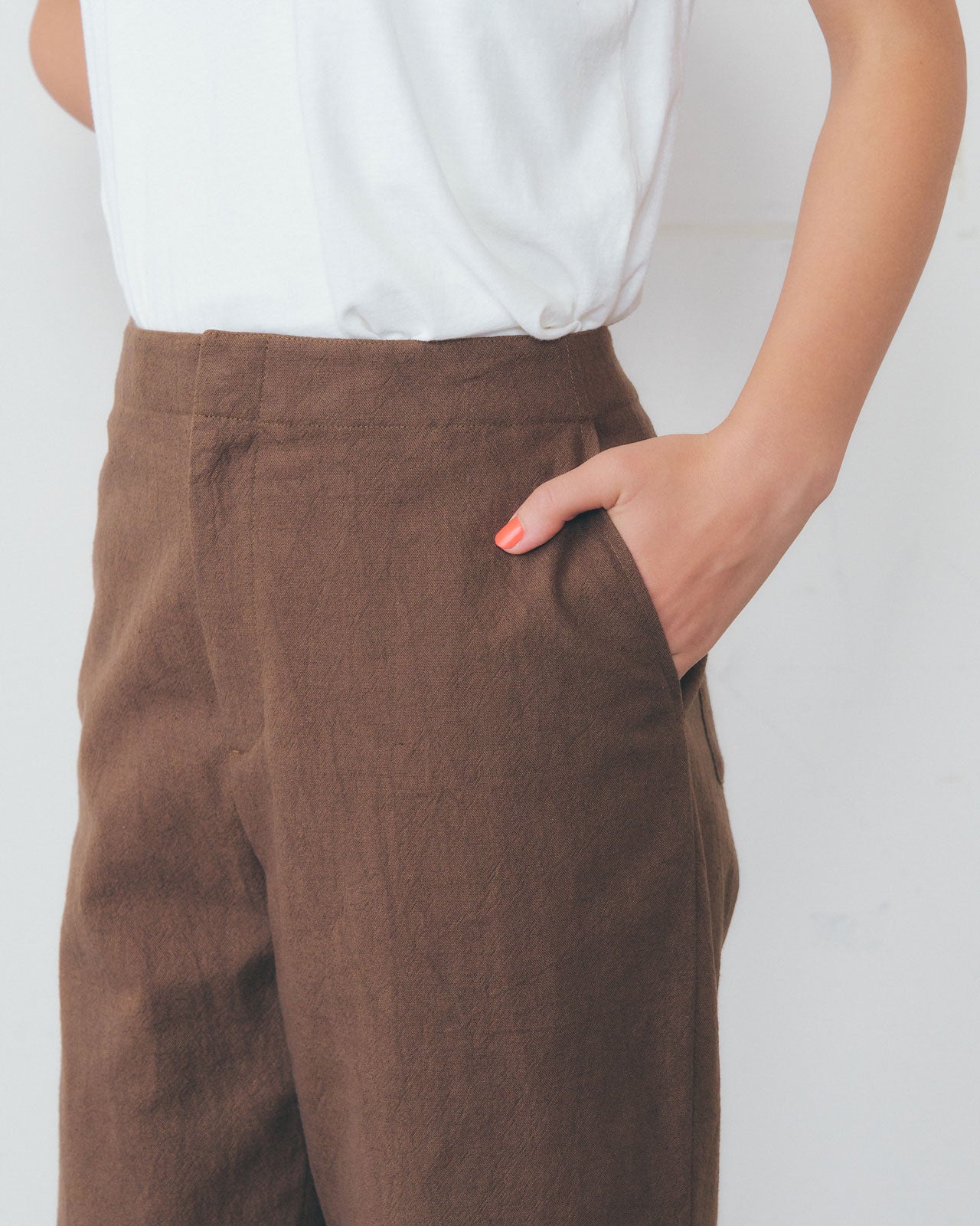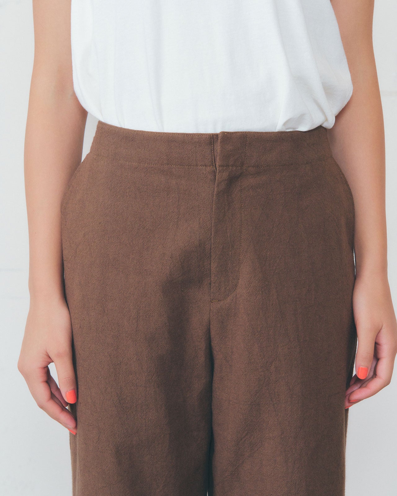 洗いをかけたラフな風合いの生地が、快適な穿き心地。 一枚ではもちろん、同素材のジレと合わせてセットアップでもお楽しみいただけます。 グラフィックTシャツやシャツに合わせて、Shinzoneらしい夏のスタイルを楽しんでください。