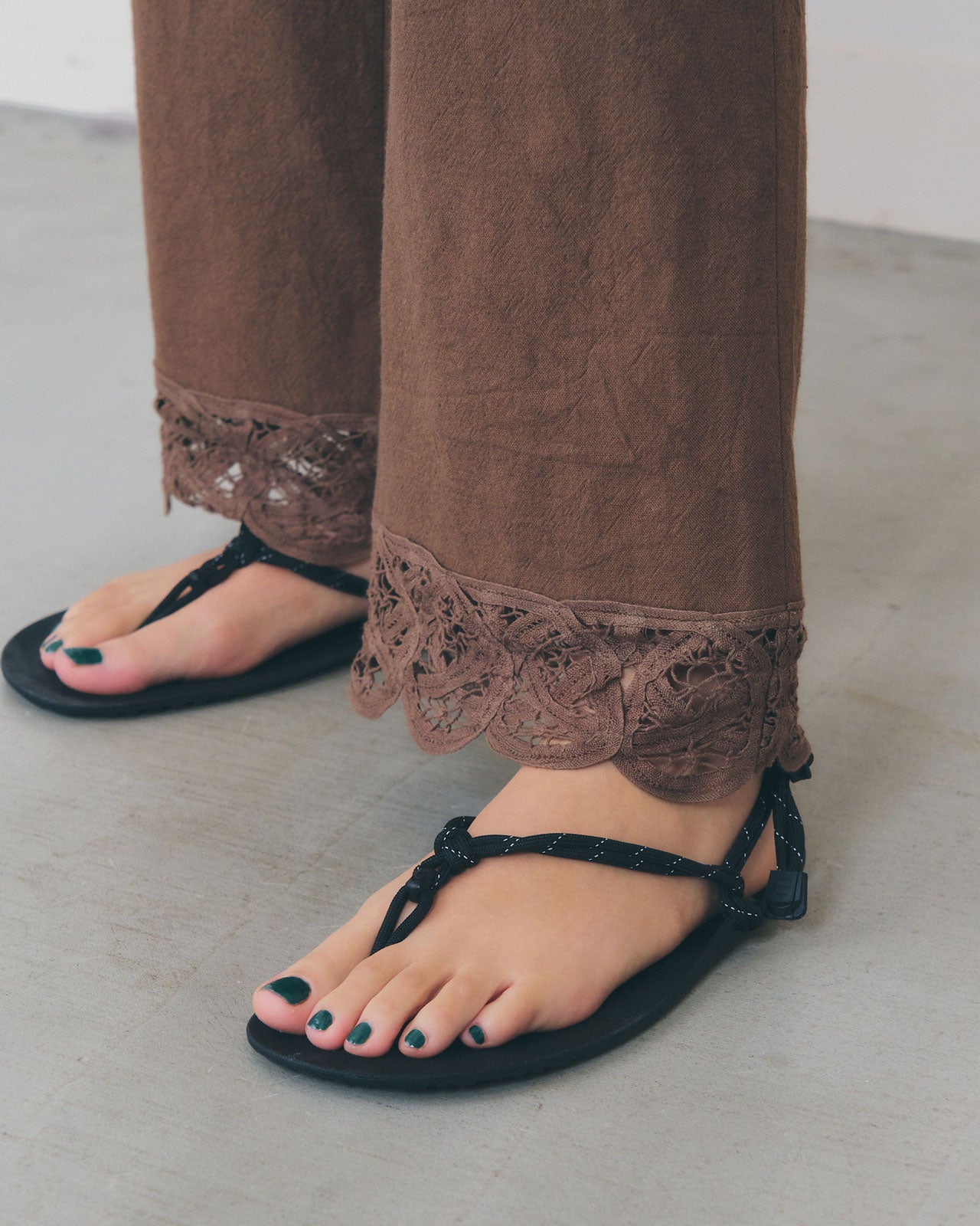 華やかなバテンレースを裾にあしらったクロップト丈のパンツ。