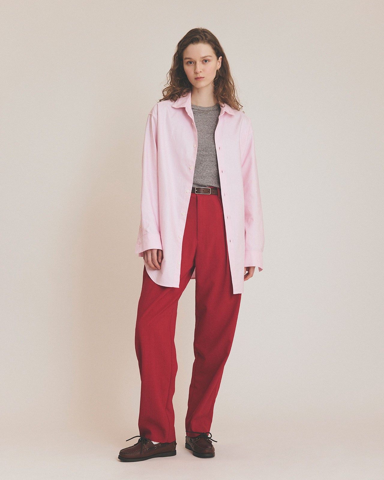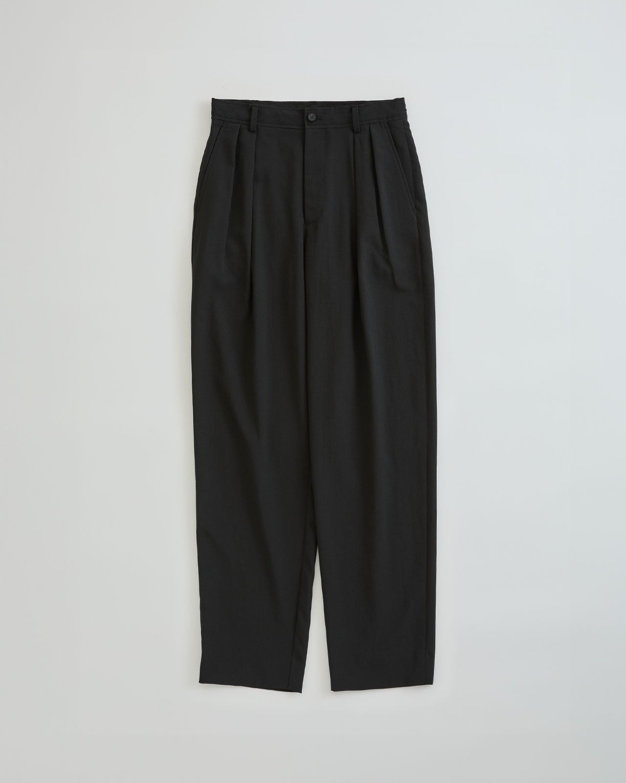 軽いハリのあるポリエステル素材にビンテージシワ加工を施し、表情とシャリ感をプラス。杢調の染色が落ち着いた雰囲気を演出します。 まるで天然素材のようなさらりとした質感と、付かず離れずの絶妙なバレルタックシルエットが、暑い日でも風通し良く快適な穿き心地を約束。オンオフどちらのスタイルにも合わせやすい、ヘビロテ間違いなしの一本です。