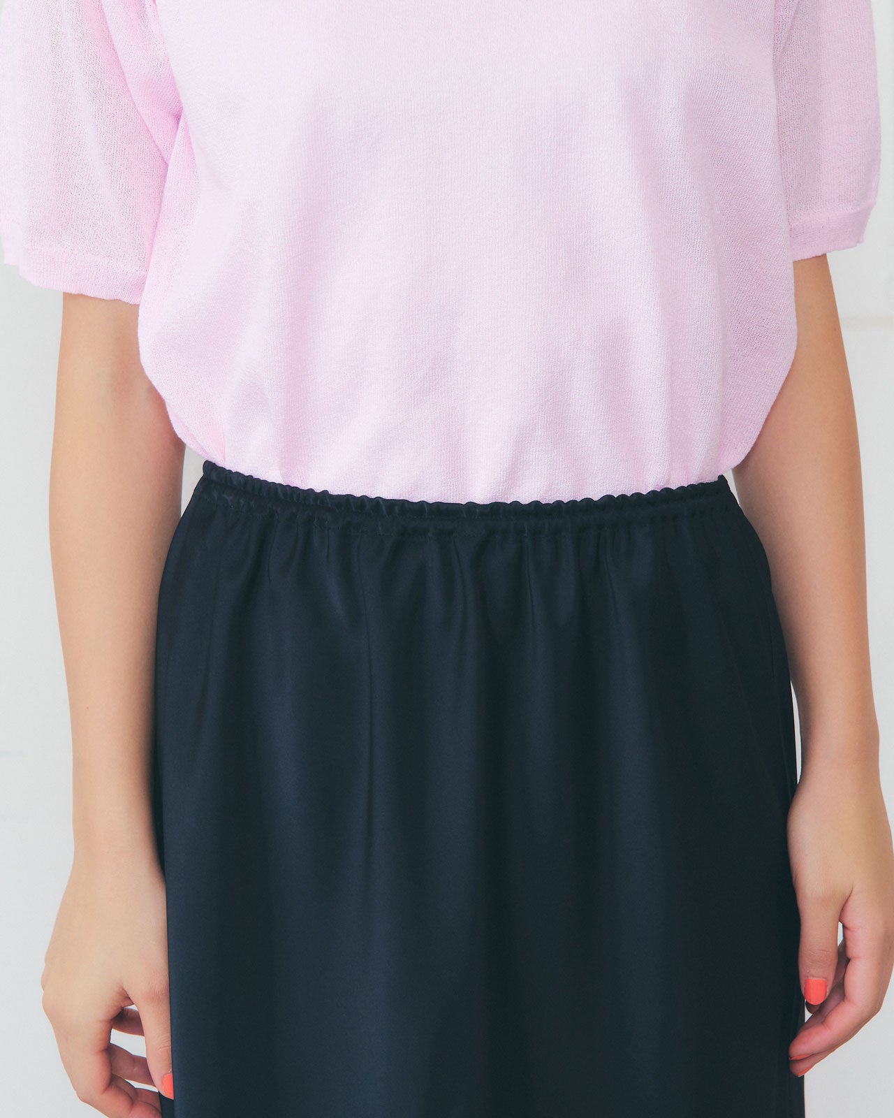 THE SHINZONEで人気のバイヤススカートの新作は、少し短めの膝下丈に同色の繊細なリバーレースを裾にあしらい、さりげなく華やかな印象に仕上げました。上品な光沢と程よい肉感のある生地を使用しています。
