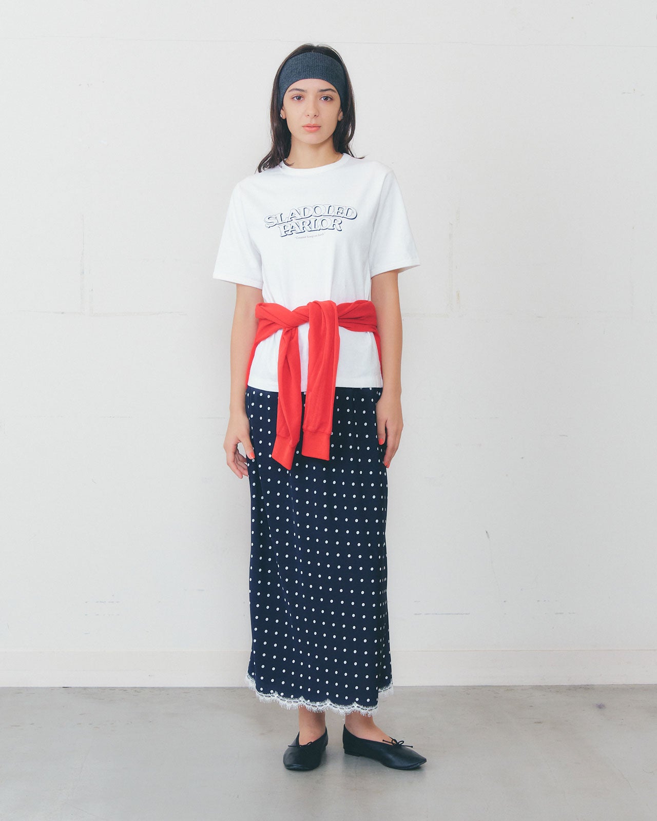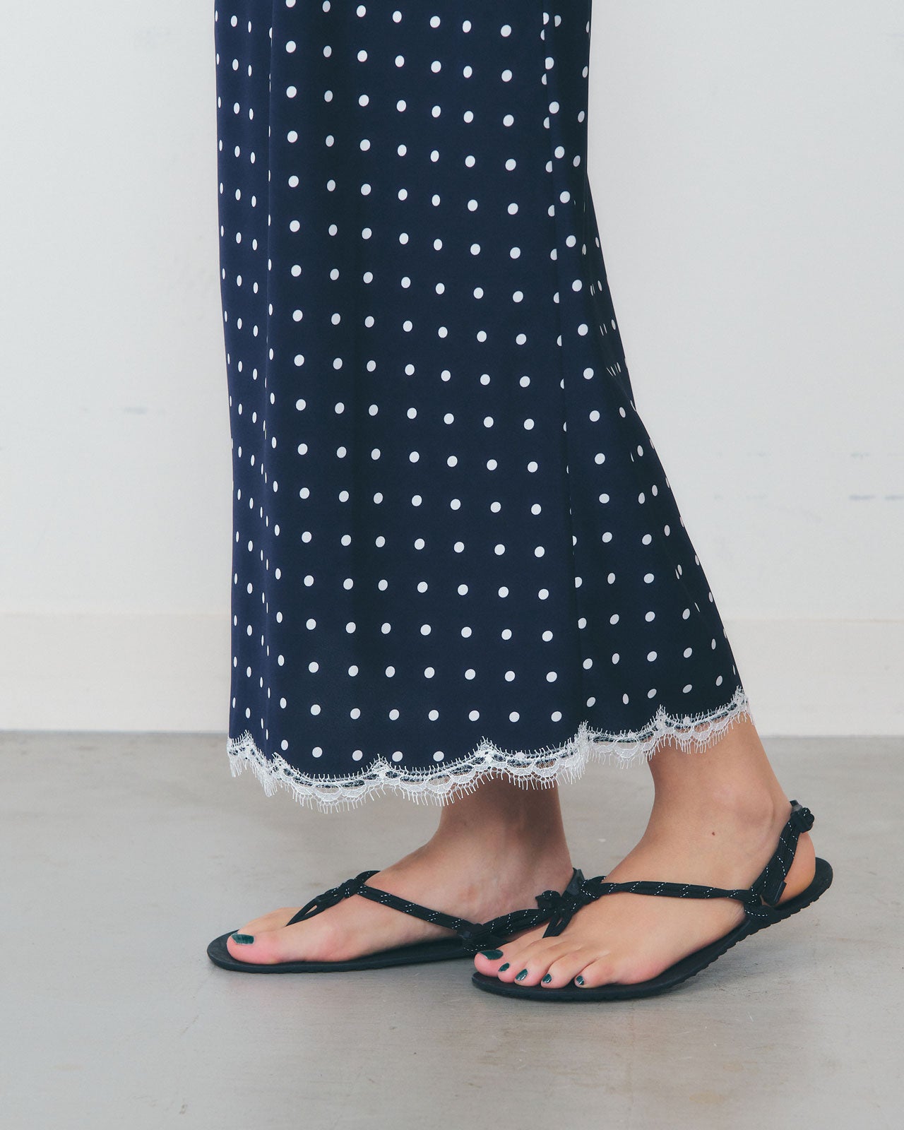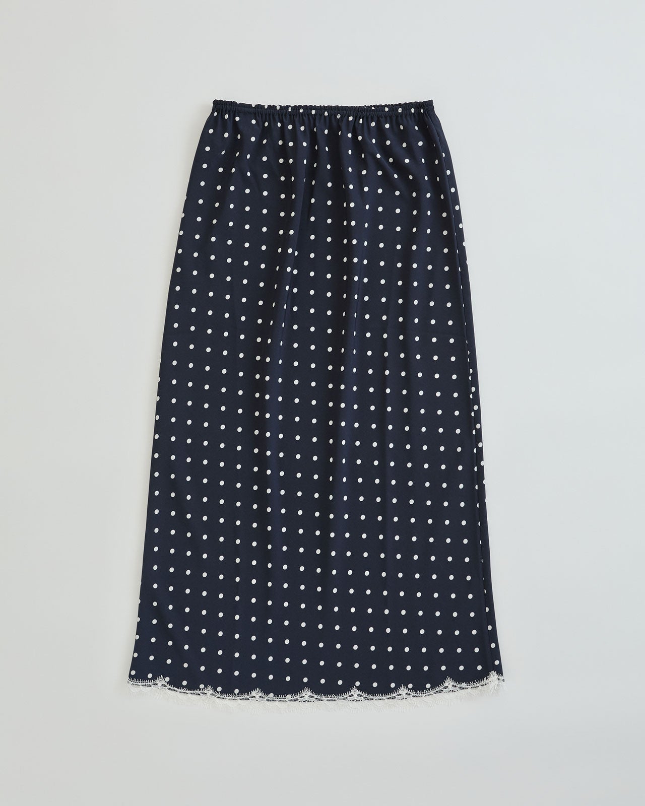 今シーズンは、少し短めの膝下丈に、白の繊細なリバーレースを裾にあしらい、さりげなく華やかな印象に仕上げました。 永遠に可愛いドット柄がスタイリングのアクセントに。グラフィックTシャツやシャツなど、どんなトップスとも好相性の便利で上品な一枚です。