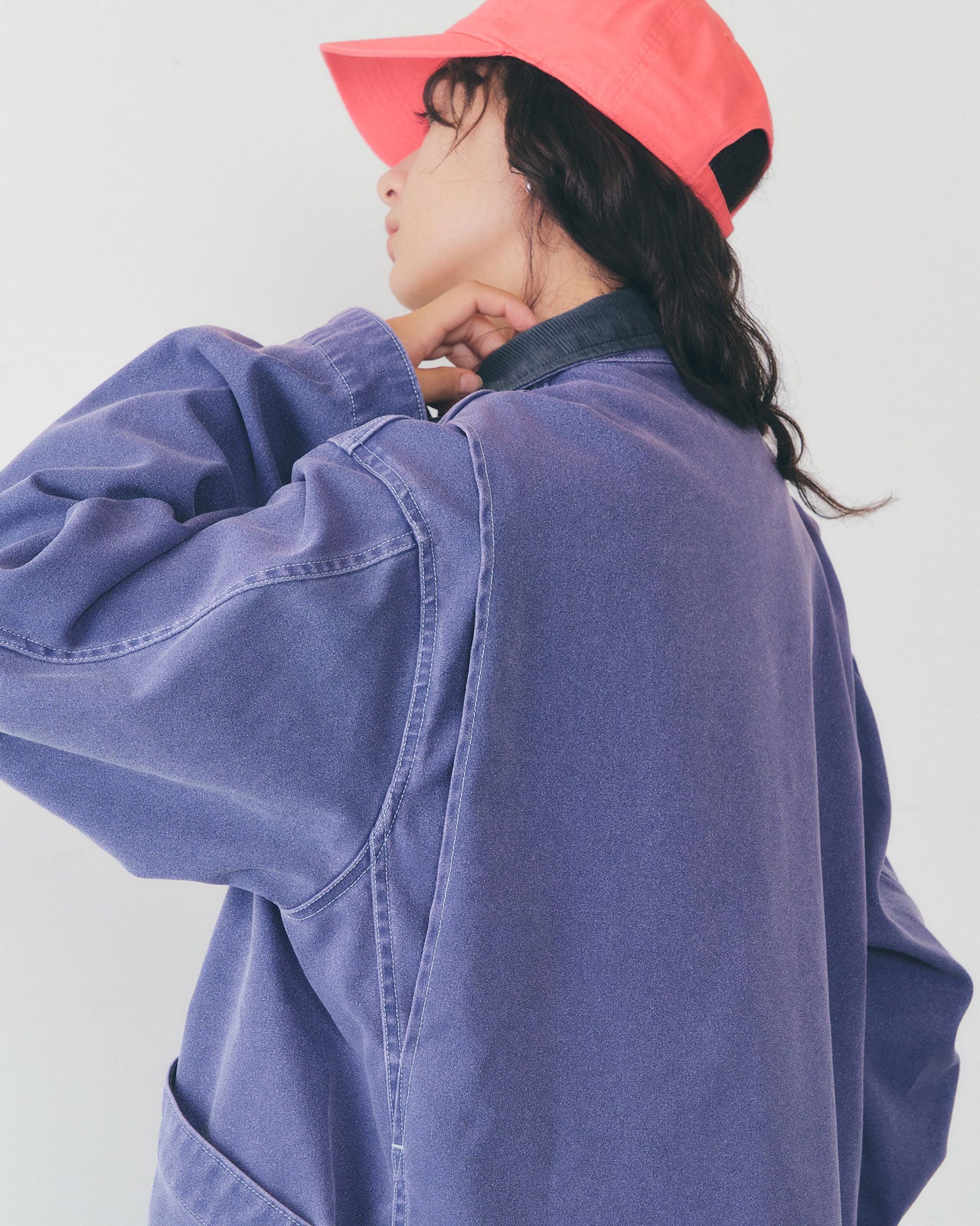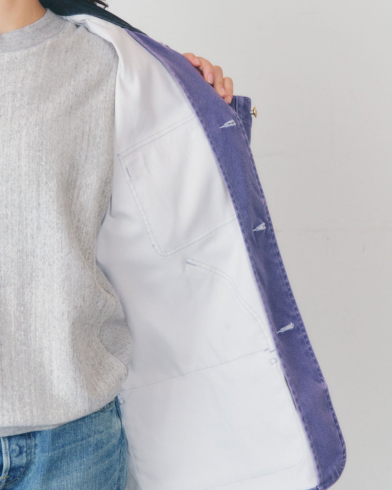 全体的にゆったりとしていてゆるやかに広がるAラインシルエットが特徴。襟と袖口の折り返し部分はコーデュロイ素材になっており、さりげなくアクセントに。春や秋に活躍するライトアウターです。