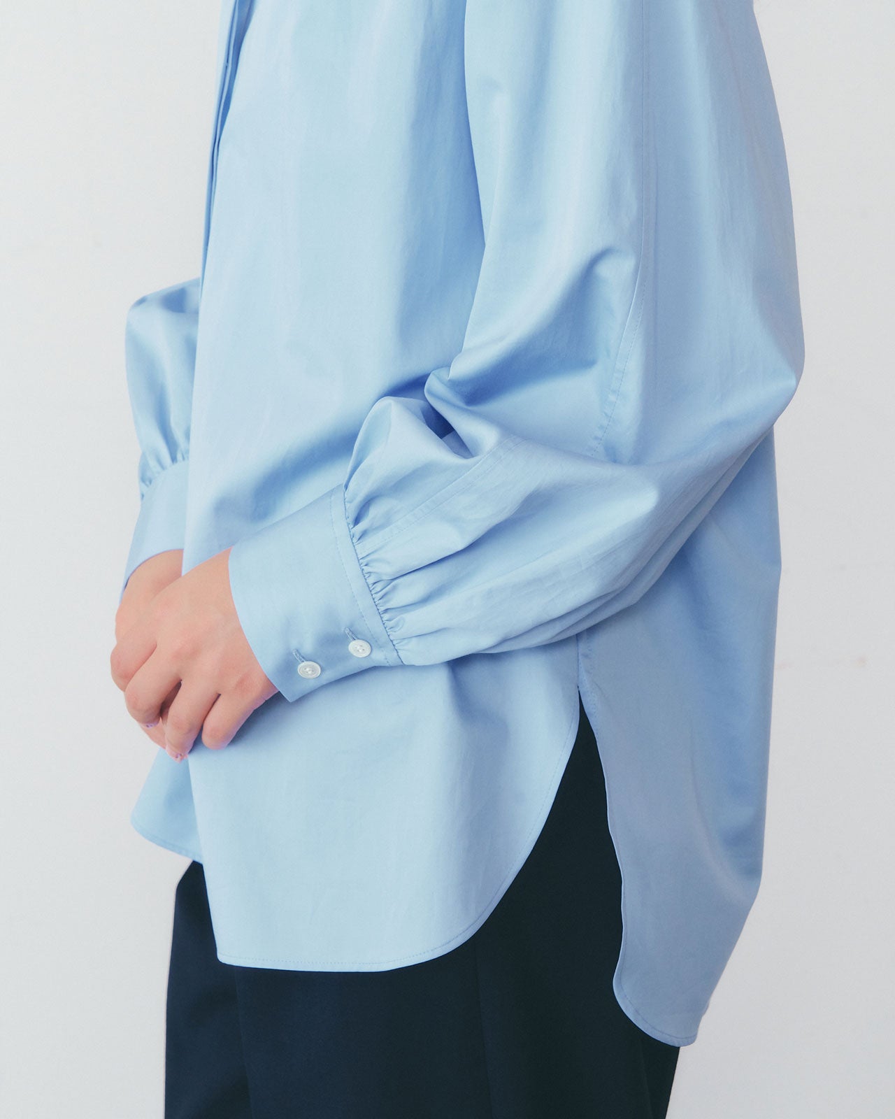 素材には、細くて上質なコットン糸を使用し、なめらかで程よい光沢のあるサテン生地に仕上げました。 さらに、きれいめな表情とほどよいハリ感を引き出す特別な加工を施しています。 袖にはふんわりとしたボリュームを持たせ、後ろ身頃には深めのベンツを入れて風通しよく。