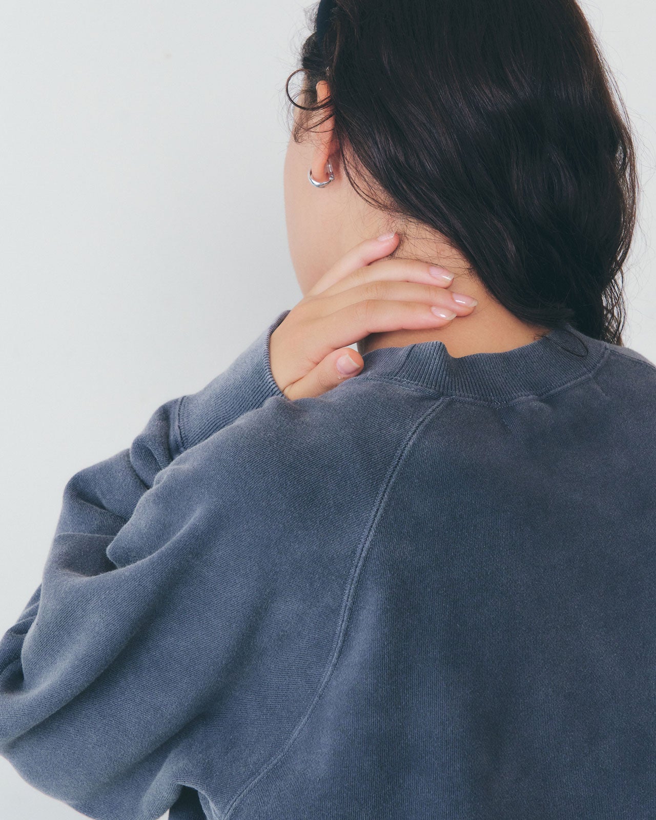 ナノミストブリーチ加工が特徴の製品染めスウェットシャツ。