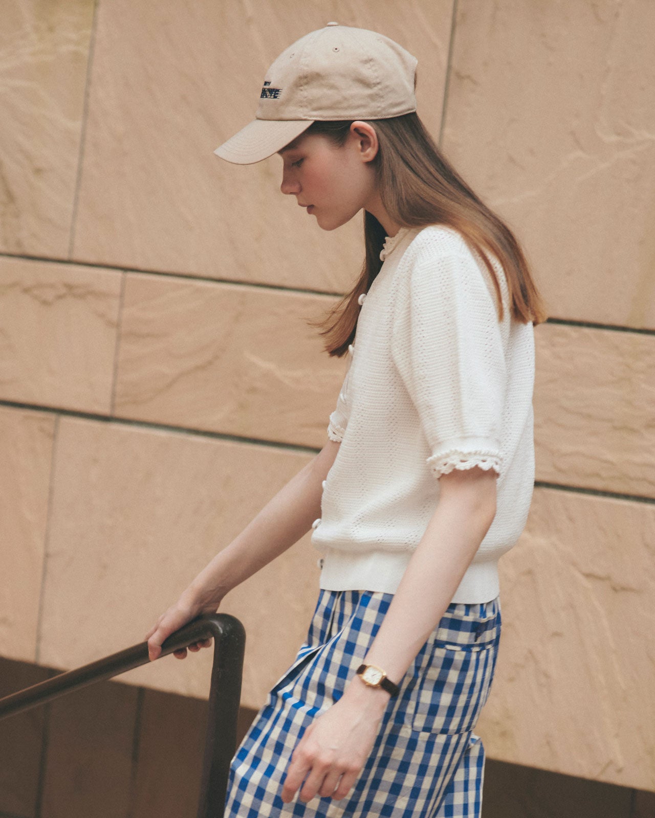 透け感のあるレース編みの半袖ニットカーディガンです。