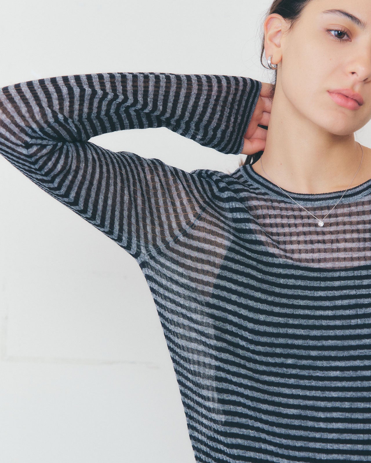 ロングスリーブ シアーリブトップ 麻とポリエステルを組み合わせた国内紡績の糸を使用。細番手で編み立てた素材は、ドライな肌ざわりと程よい透け感、軽やかなハリ感が特徴です。 こちらはリブ編みにすることで、フィット感を持たせながらも優れた伸縮性を実現。コンパクトなシルエットながら、快適に着用いただけます。 印象的なカラフルボーダーは、シアー素材ならではの透け感と重なりによって、奥行きのあるニュアンスを演出。レイヤードスタイルのアクセントとしても活躍します。