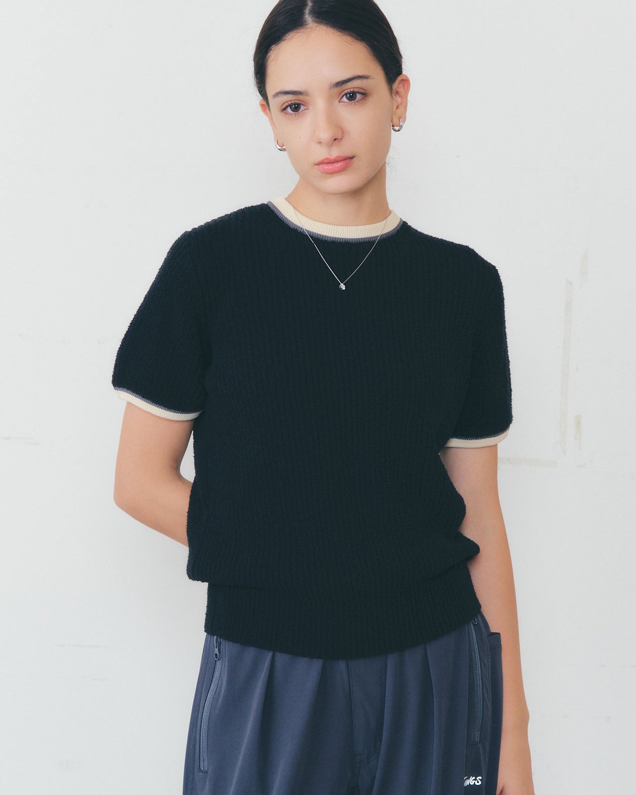綿のパイル糸にナイロン糸を巻きつけた、表情豊かな特殊糸を使用。畦編みによる伸縮性と、綿主体のさらりとした肌ざわりで、風通しもよく快適に着用いただけます。襟元と袖口には配色を効かせ、スポーティなムードをプラス。クラシックなリンガーTのシルエットに、ニットならではの質感と機能性を掛け合わせた、実用的な一枚です。